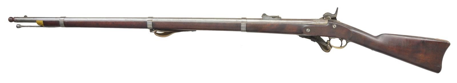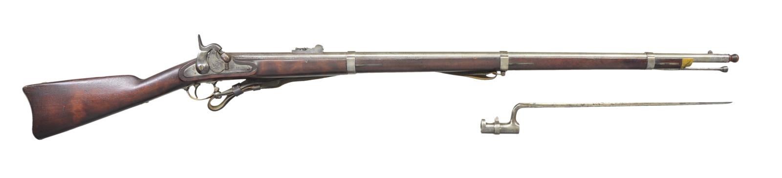 VP / eaglehead proofs on breech, no discernible barrel date, long range adjustable ladder rear sight, brass nose cap, 3 flat spring retained barrel bands. Lock has Maynard tape devise with hinged door stamped with spread wing eagle, "U.S. / HARPERS FERRY" & "1858" at tail. Walnut stock has 2 clear cartouches "BM & "JAS". Buttplate surcharged "US". Bayonet has 18" blade with US surcharge. This was the most advanced and modern longarm in Southern arsenals at beginning of Civil War, few survive unmolested like this example. The original ramrod has .565" diameter head which was changed by 1859 to .540-.550 as larger original diameter was found difficult if not impossible to use in fouled bores from previous firing (Moller p 253). UNATTACHED ACCESSORIES: wood tompion, bayonet, & sling. PROVENANCE: Michael E. Bray estate collection. CONDITION: very good to fine overall, crisp markings, metal cleaned mostly bright/gray, stained, pitting at breech, stock sound with sharp edges, crisp cartouches. Mechanics fine, crisp rifled bore. Bayonet & original leather military sling match musket well. These guns saw hard service in Civil War, this is superior survivor 100% original & complete. ANTIQUE. (01-23288/JS). $2,500-3,500.