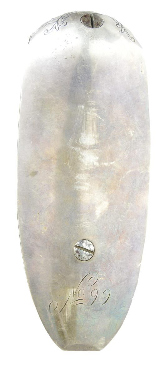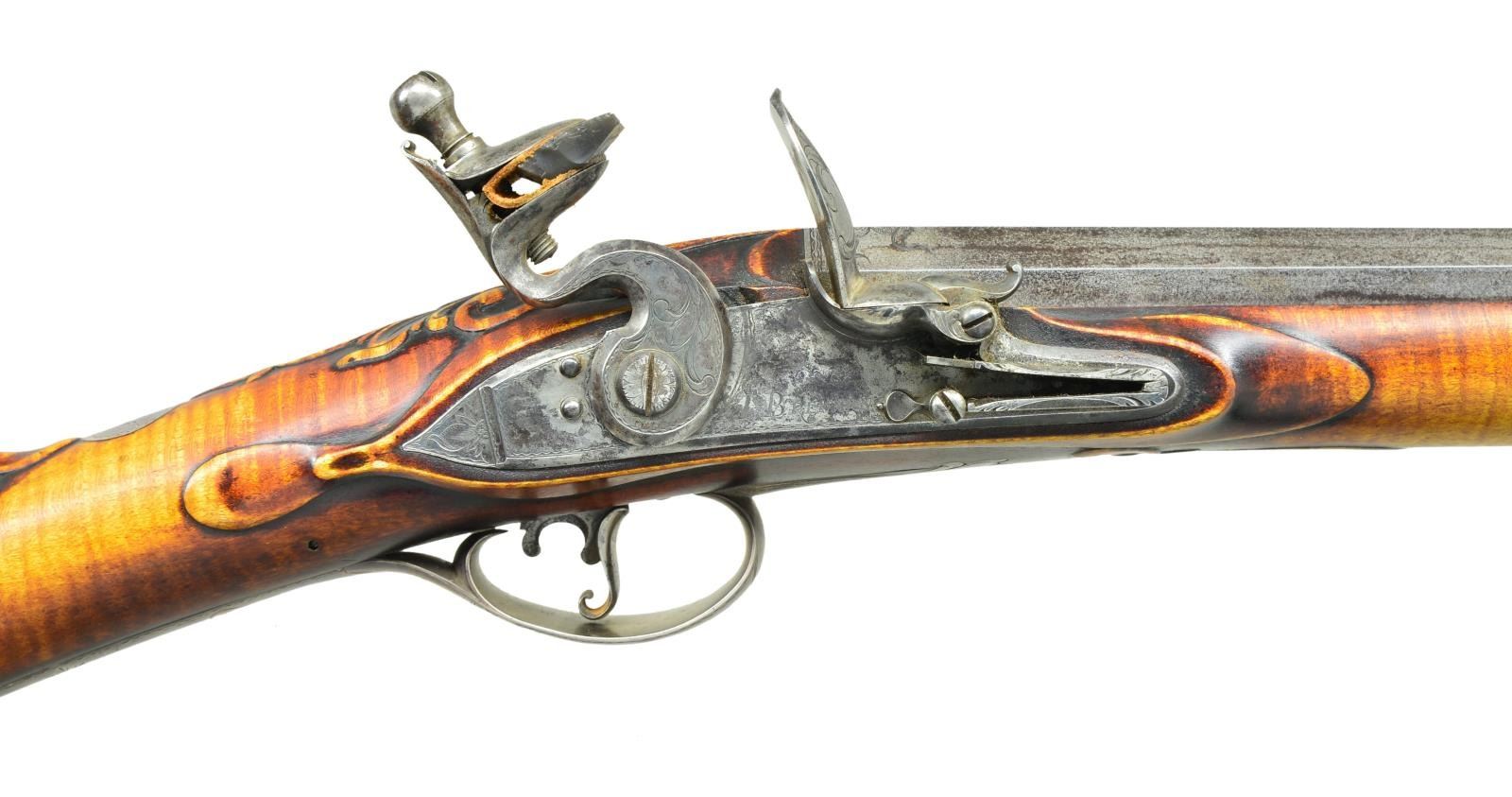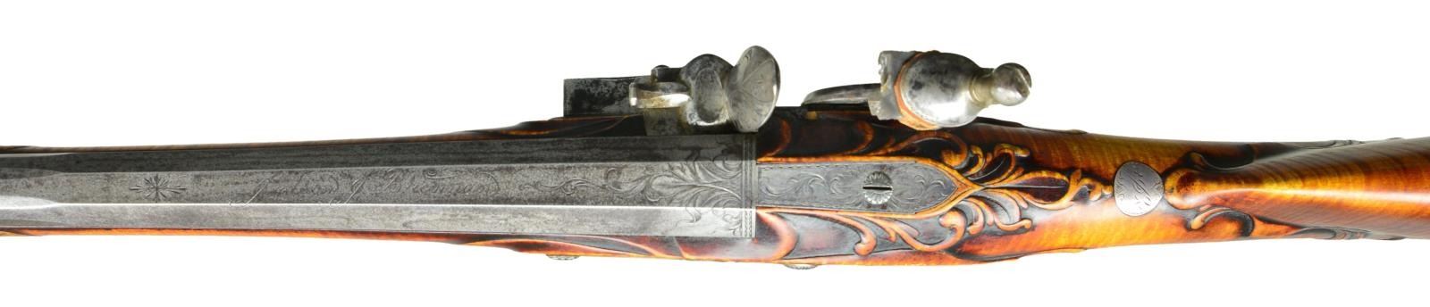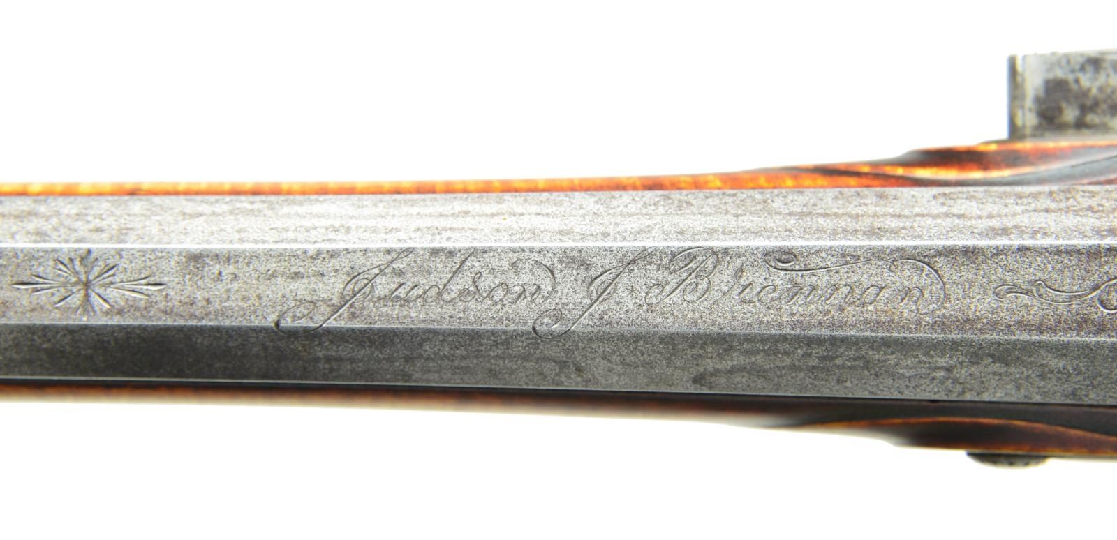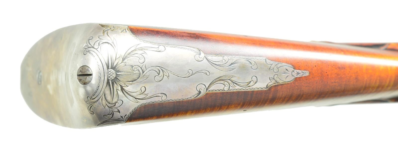BRENNAN. Cal. 16 bore. S#99. 52” overall, 36” oct. to half 16-sided to half 32-sided to round barrel signed on to flat "JUDSON J. BRENNAN". Hand forged rebated lock engraved “I. BRENNAN”. Breech, barrel tang, lock, & cock elegantly minimalist engraved en suite. Silver trigger guard, side plate, buttplate Fingly engraved, and “No. 99” engraved on rear of buttplate. Silver thumb plate engraved with monogram “NEJ”. Curly maple stock is relief carved on wrist, rear of barrel tang, forward of trigger guard, and rear of thimble. CONDITION: find overall, a few scattered storage nicks, scuffs and dings. Mechanically fine with bright shiny bore. (01-21959/JS). ANTIQUE. $2,000-4,000.