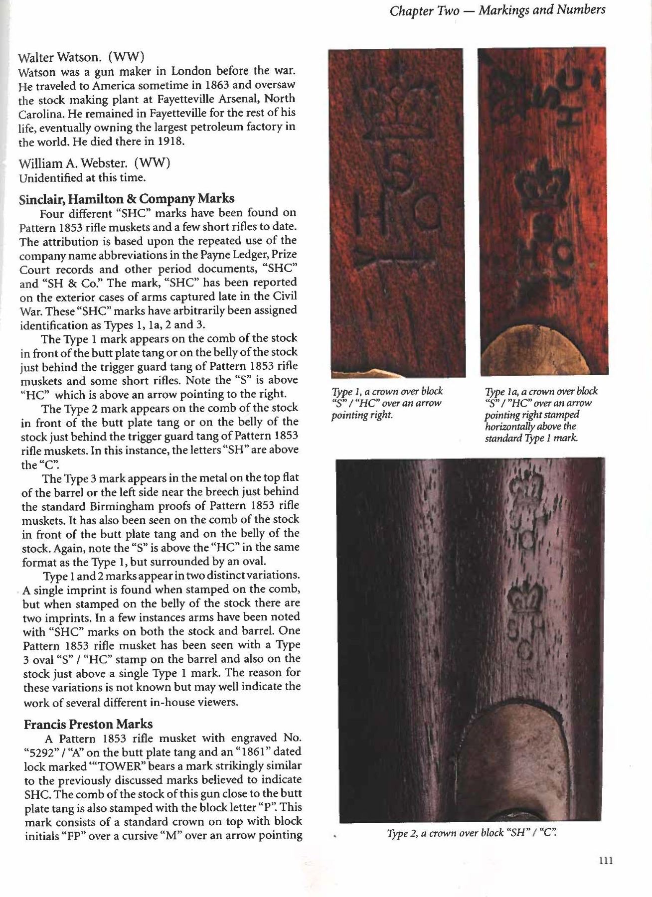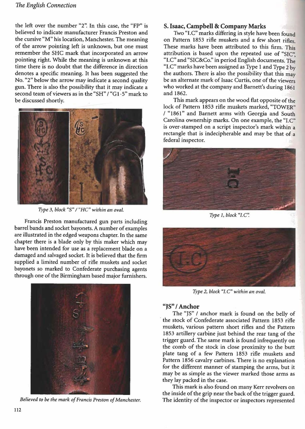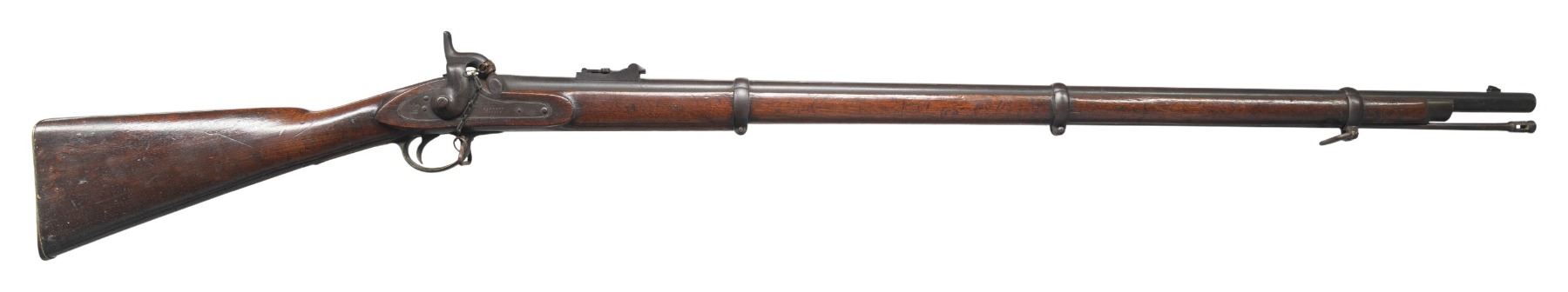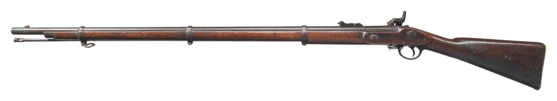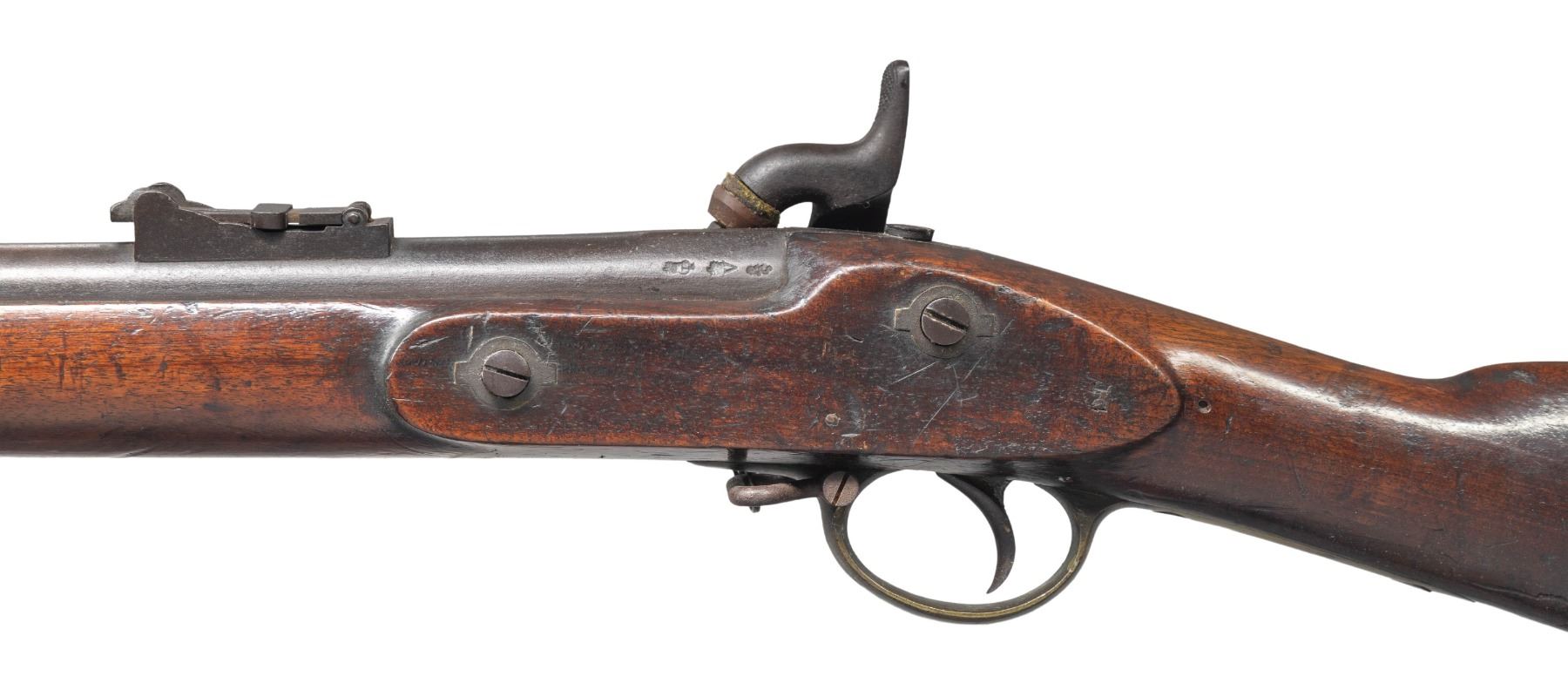 1862 DATED BARNETT RIFLE MUSKET. Cal. 577. NSN. Standard configuration of the South's most popular import musket, 39" barrel, brass furniture, three iron clamping bands. Lock marked with crown & "BARNETT / LONDON". London proved barrel, stock stamped "IC" opposite lock and Sinclair Hamilton marking: "crown / "S / HC / arrow" on comb forward of stamped buttplate tang. "IC" is known Confederate inspector found on other blockade run British muskets. An original chained Enfield nipple protector is attached to rear sling swivel. UNATTACHED ACCESSORIES: pertinent pages showing markings from Pritchard & Huey "The English Connection". CONDITION: fine "as found" overall, complete, matching, & all original, dark iron and brass patinas, crisp mechanics, good rifled bore. PROVENANCE: Estate Collection of John "Jack" Dhooghe. (01-28233/JS). ANTIQUE. $2,000-4,000.