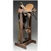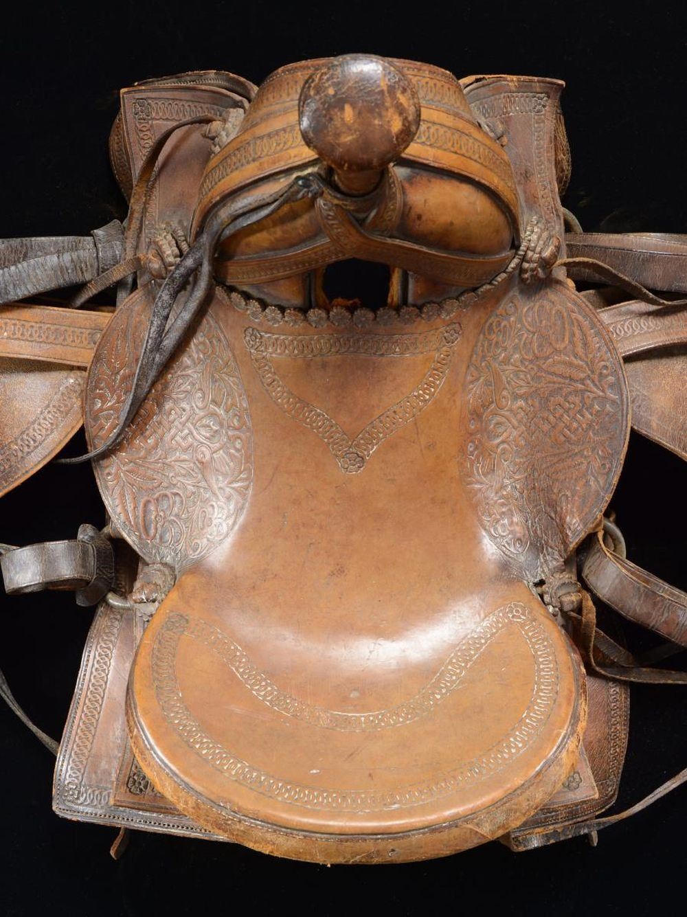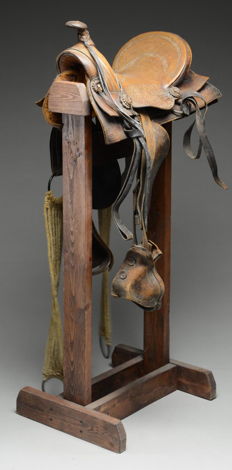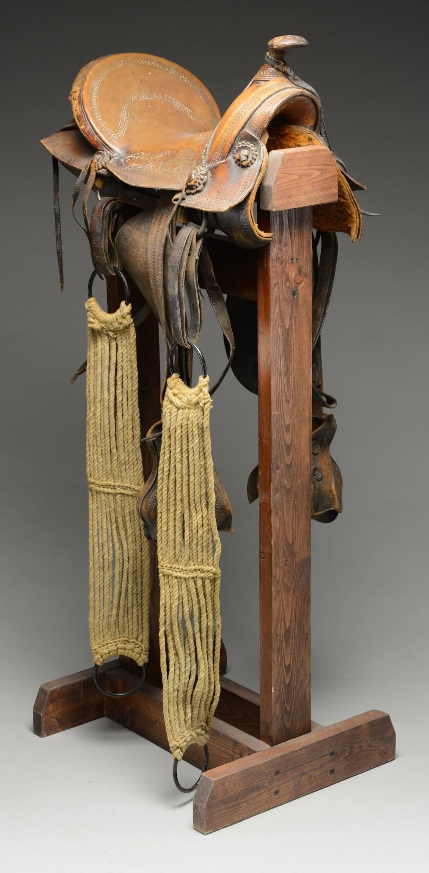 1900. This child-sized saddle measures approx. 17" long and 12" wide. Saddle is complete with matching tooled, shrouded wood stirrups. UNATTACHED ACCESSORIES: descriptive sheet. CONDITION: very good overall; the high edge of the back is scuffed; brown leather has most of its finish remaining. PROVENANCE: Martin Lane Historic & Western Americana Lifetime Collection. (02-21638/JS). $400-600.