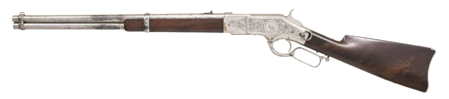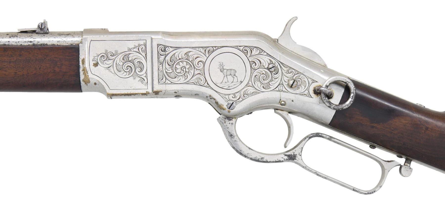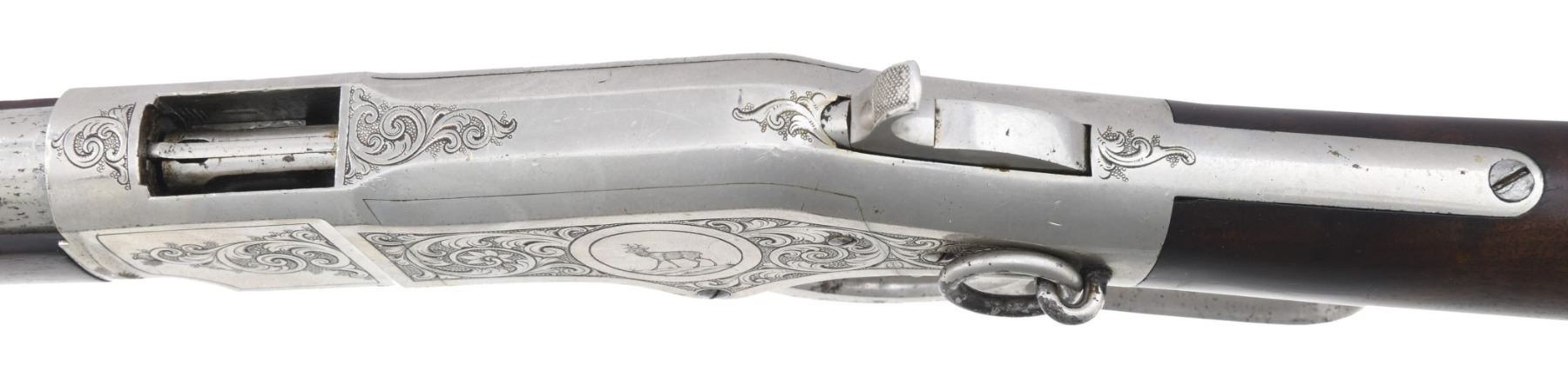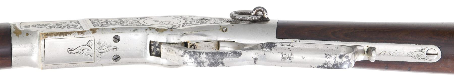Cal 44. S# 132675. Standard configuration, 20" barrel, 2 lines "Kings Improvement" address, two position adjustable sight, full nickel plating and distinctive Ulrich floral scroll engraving with well rendered vignette of an antlered deer.Ulrich family engraving style is shown in Larry Wilson's Winchester engraving book and virtually identical elements are found on John Ulrich and Conrad Ulrich 66s or 73s made 1877-1879 including nickel plating. Serial number 132675 for 1877 is engraved on lower rear tang. Lower tang internally on the left side is stamped "XX" for deluxe wood, along with assembly number "59" which is also found internally on butt plate and top tang channel of nicely figured walnut stock, both stock and butt plate have a purposely factory obliterated different serial number with the assembly number 59 stamped adjacent. This is an attractive nice condition honest unmolested Ulrich engraved deluxe nickel 66 carbine. UNATTACHED ACCESSORIES: factory letter confirming factory engraving and nickel. Copies of pertinent pages from Larry Wilson's Winchester engraving book showing John and Conrad Ulrich engraving elements approving attribution. CONDITION: fine overall, frame retains over 90% original nickel; lever, barrel, magazine, & barrel bands retain about 80% scuffed nickel with scattered cosmetic blemishes. Barrel address has about 1/2" dented/scratched area. Stock is sound, well fit, small screwed escutcheon plate on belly. Mechanics are fine, good rifled bore. (01-26421/JS). ANTIQUE. $20,000-30,000.