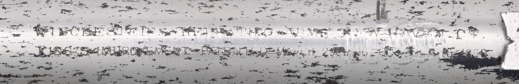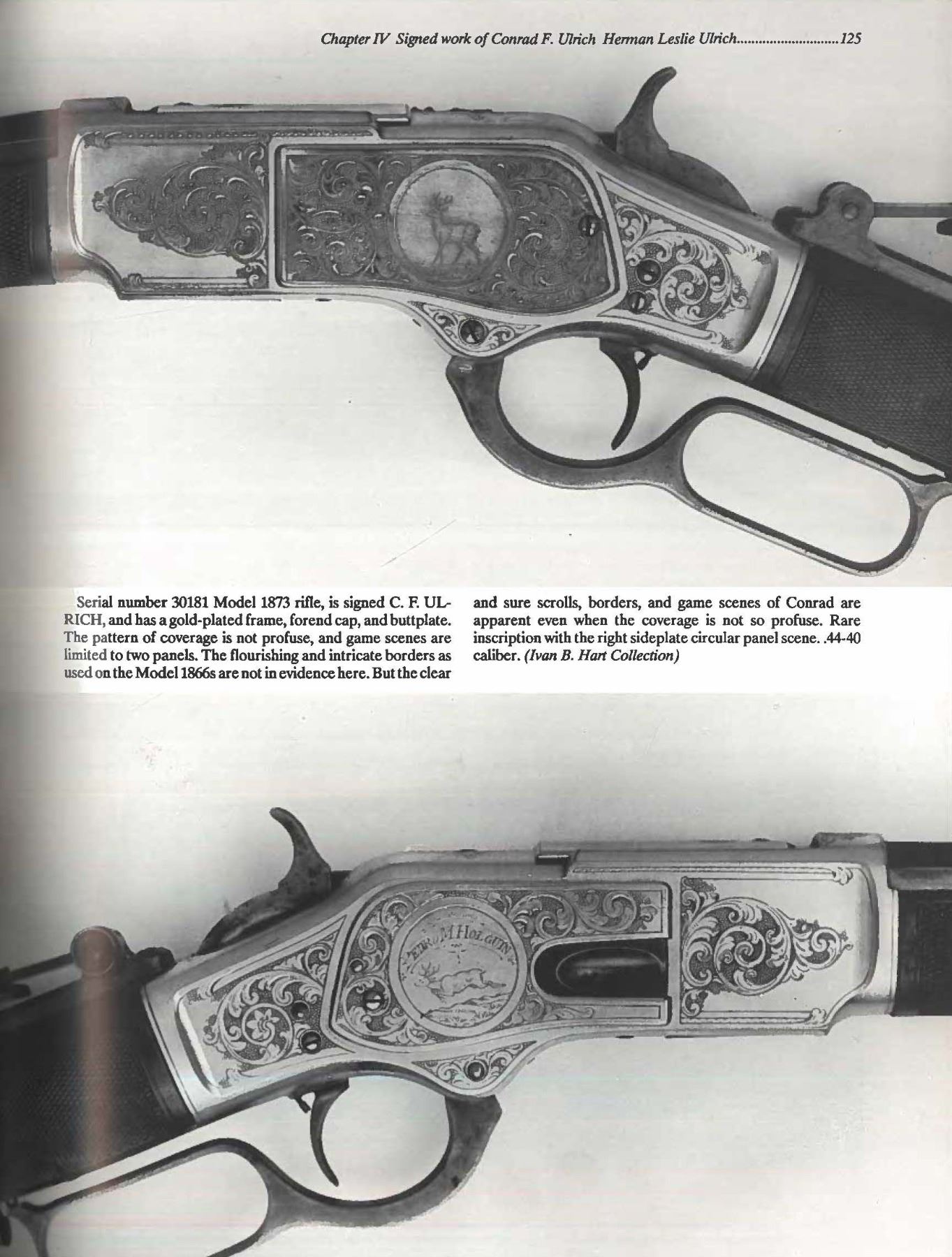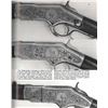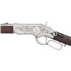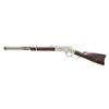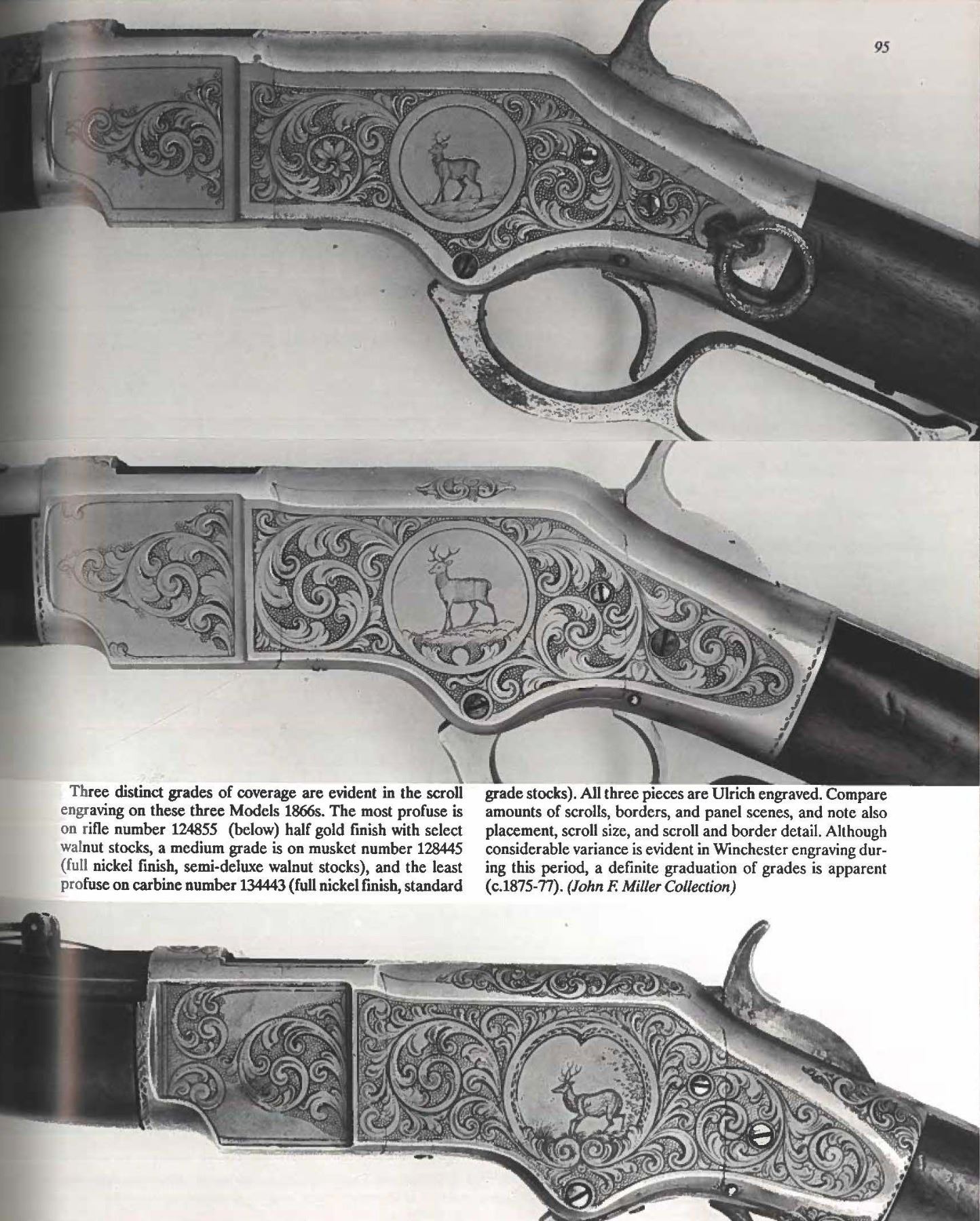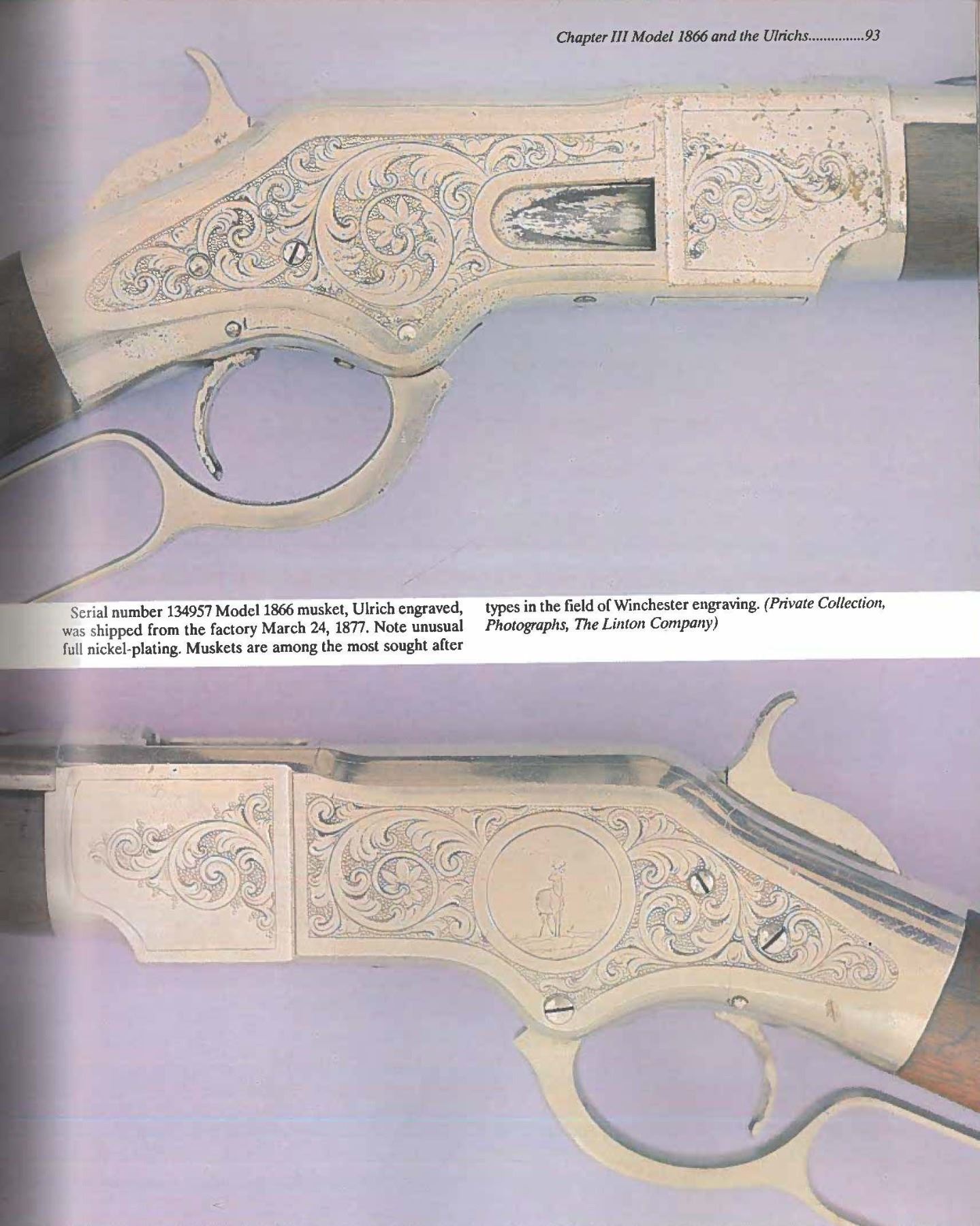 Cal 44. S# 132675. Standard configuration, 20" barrel, 2 lines "Kings Improvement" address, two position adjustable sight, full nickel plating and distinctive Ulrich floral scroll engraving with well rendered vignette of an antlered deer.Ulrich family engraving style is shown in Larry Wilson's Winchester engraving book and virtually identical elements are found on John Ulrich and Conrad Ulrich 66s or 73s made 1877-1879 including nickel plating. Serial number 132675 for 1877 is engraved on lower rear tang. Lower tang internally on the left side is stamped "XX" for deluxe wood, along with assembly number "59" which is also found internally on butt plate and top tang channel of nicely figured walnut stock, both stock and butt plate have a purposely factory obliterated different serial number with the assembly number 59 stamped adjacent. This is an attractive nice condition honest unmolested Ulrich engraved deluxe nickel 66 carbine. UNATTACHED ACCESSORIES: factory letter confirming factory engraving and nickel. Copies of pertinent pages from Larry Wilson's Winchester engraving book showing John and Conrad Ulrich engraving elements approving attribution. CONDITION: fine overall, frame retains over 90% original nickel; lever, barrel, magazine, & barrel bands retain about 80% scuffed nickel with scattered cosmetic blemishes. Barrel address has about 1/2" dented/scratched area. Stock is sound, well fit, small screwed escutcheon plate on belly. Mechanics are fine, good rifled bore. (01-26421/JS). ANTIQUE. $20,000-30,000.