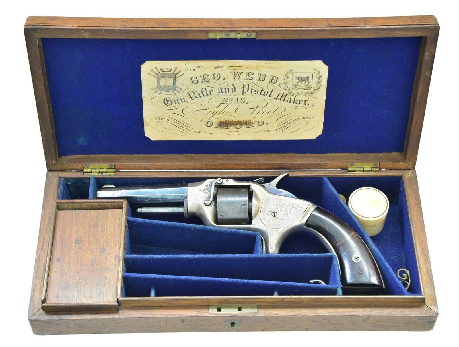 9" overall, solid silverplated brass frame, blued tapered octagonal barrel with British proofs, no maker marks other than "G*W" & "0" on grip frame. Silver plated heavy solid German silver frame, shrouded spur trigger, unique design spring loaded hand on top strap that holds cylinder when cocked, ebony grips, sparse scroll engraved. Mahogany casing, with blue baize lined compartments, large paper label inside lid: "GEO WEBB / Gun, Rifle, and Pistol Maker / No. 19 / High Street / Oxford". Case retains steel cleaning rod, added pack of Winchester cartridges with illustrated label.