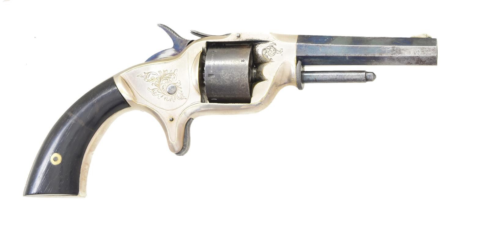 REVOLVER MADE FOR PHILIP G. BARTHROPP, ENGLISH ADVENTURER, CIVIL WAR & FENIAN REBELLION SOLDIER, & SPORTSMAN. Cal. 32. S# NSN. Bbl. 4". George Webb is obscure Oxford, England gunmaker who sold his custom made guns to the wealthy elite. He worked at 19 High Street, Oxford 1862-1869. Inscribed on plaques on lid of case are Barthropp coat of arms "wings pierced by arrow" & "P.G. BARTHROPP"