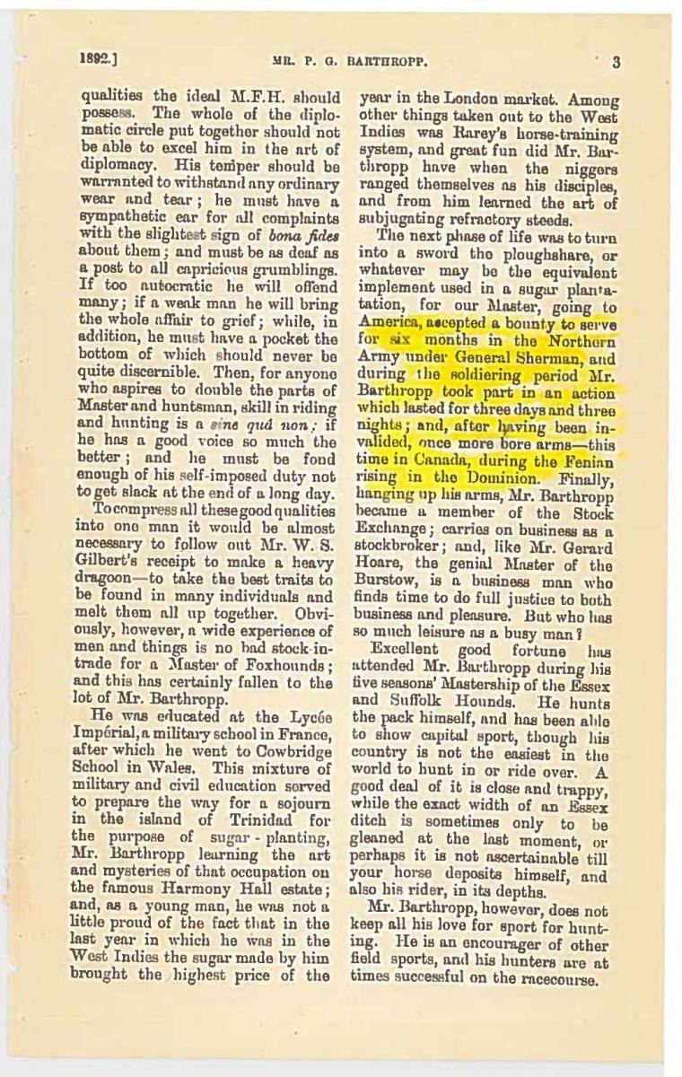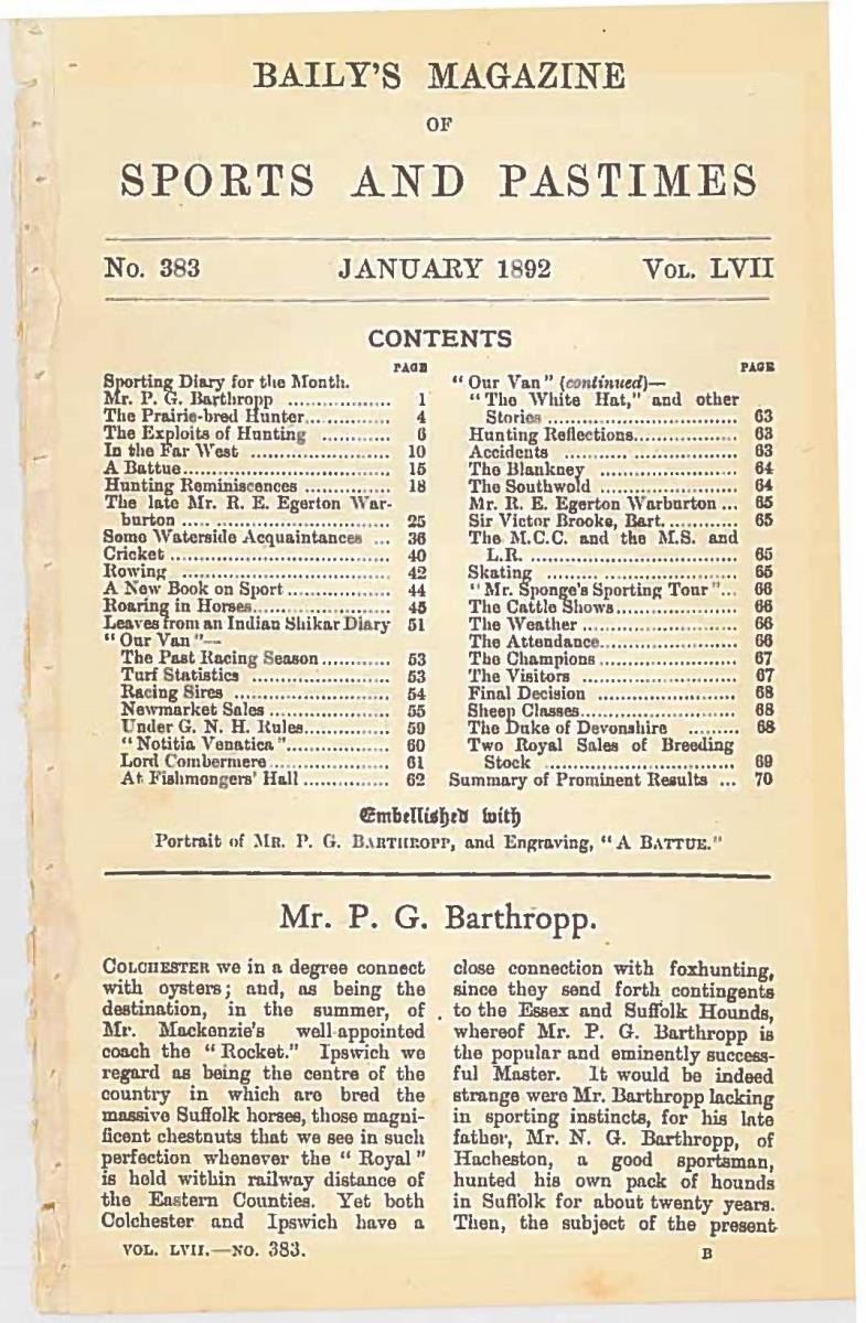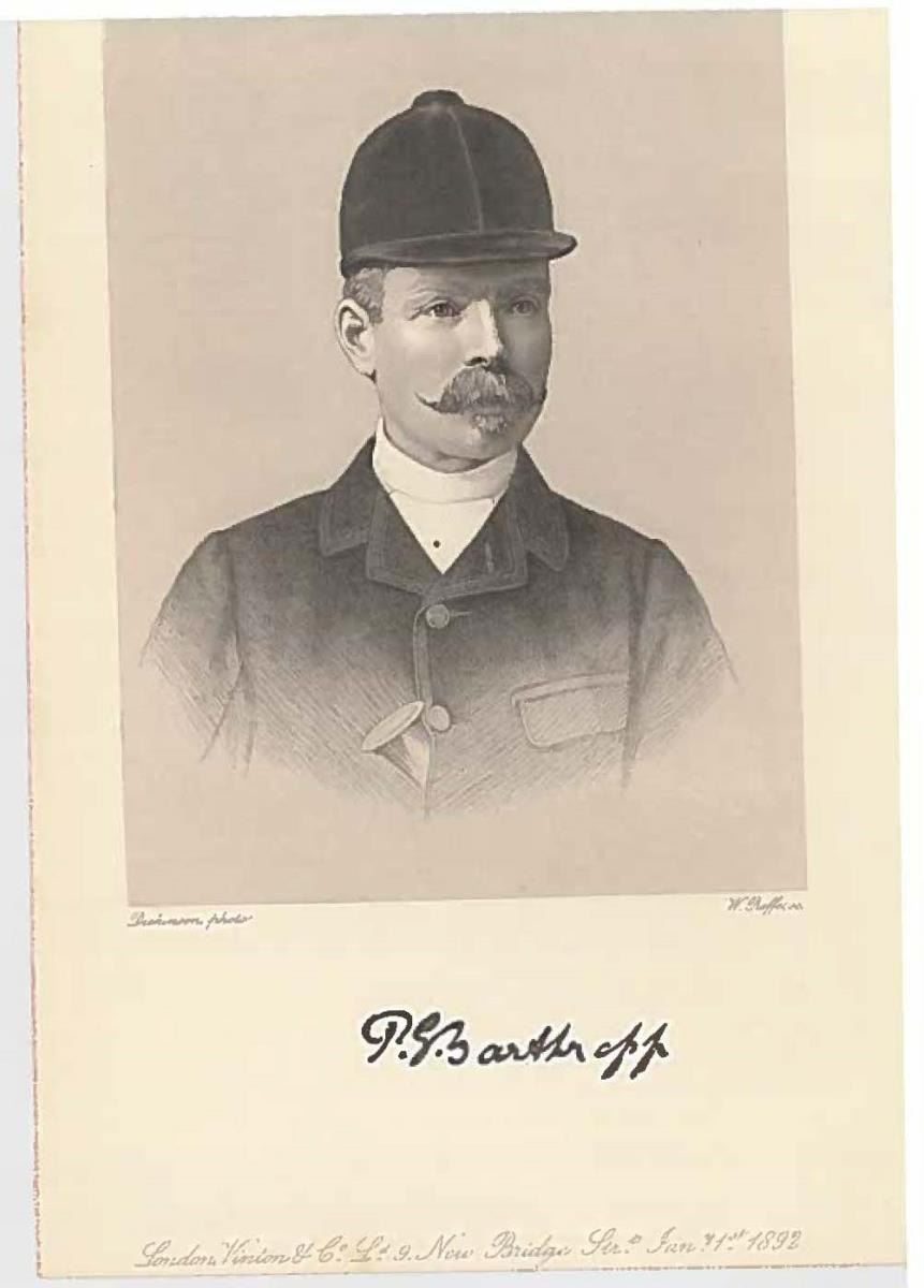 Philip G. Barthropp (1844-1912) educated at "École spéciale militaire" an elite French military school & still in operation today. According to his biography he came to America and fought under Sherman for 6 months and later took part in quelling the Fenian Rebellion in Canada. He went on to the West Indies to manage family’s sugar plantation where in his spare time was horse training. When back in England he was involved in horse racing, and hunting from horseback, fox hunts he was master of the hunts for most of his life. He worked as stockbroker in London till death in 1912 always involved with horses. UNATTACCHED UNATTACHED ACCESSORIES: large file of research materials and original 1892 engraving of Barthropp. CONDITION: fine overall, retaining much original silver & blue finish, mechanic fine, crisp rifled bore. Casing fine overall, cartridge pack label scuffed but complete, functioning key. (01-22887/JS). $3,000-5,000.