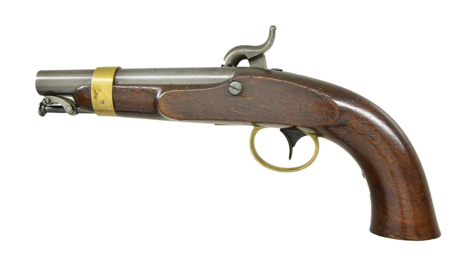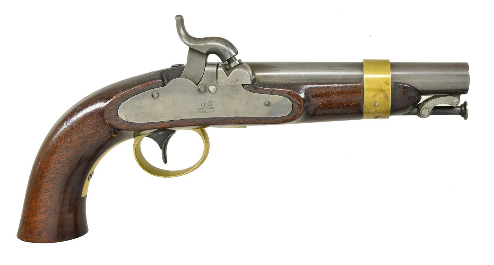 BOXLO1 PERCUSSION PISTOL. 54 cal. NSN. Standard configuration, 12” overall, 6” round barrel proofed “RP / P” at breech, brass furniture, lock marked “US / DERINGER / PHILADEL’A”, captured swivel loading assembly. Flayderman states of the 1200 made, only 300 were accepted by navy. This is the first American contract percussion pistol and fine example with inspector’s cartouche. CONDITION: very good to fine overall, original & complete, stock very good, well fit with partially discernible cartouche, mechanics fine, smooth clear bore. (01-21477/JS). ANTIQUE. $1,500-2,500.