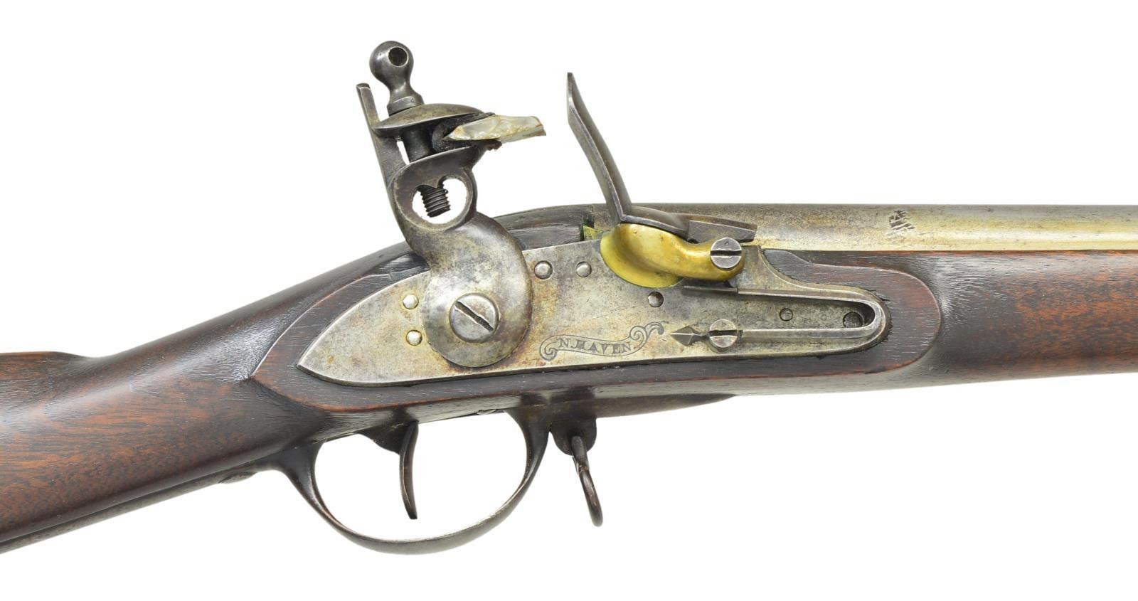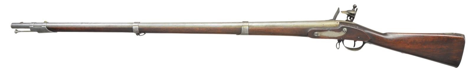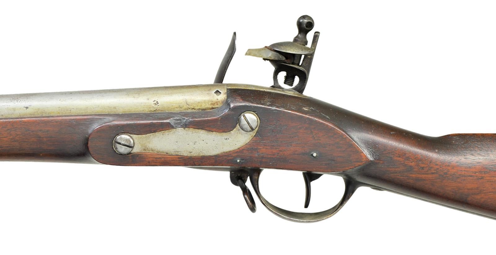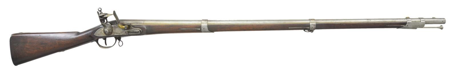 ORIGINAL FLINT. Cal. 69. NSN. Usual configuration with 42" barrel held by three spring retained bands is stamped "P" within oval on top rear. Lock with flat plate is fitted with round bodied cock, angled inset brass pan, bridled frizzen and feather spring with single spear finial. Lock is of type II variation with frizzen pivot screw 1 11/16" from front end of lock. Walnut stock is iron mounted. Trigger guard has spear at front end and rounded tail. Sling loops are welded into eyes. Inspectors mark "JN" (John Newberry) is on left side opposite lock. CONDITION: fine to very fine. Barrel and lock with light cleaning to overall gray with some brown highlights. Furniture is mostly gray to brown. Stock retains nearly all its original finish with light wear and a good scattering of marks. Bore is mostly bright with some scattered pits. Lock is very fine with all matching assembly marks (a small triangle) found on parts. PROVENANCE: From the Lifelong Collection of Glen E. Mattox. (01-22474/MGM). ANTIQUE. $2,500-4,000.