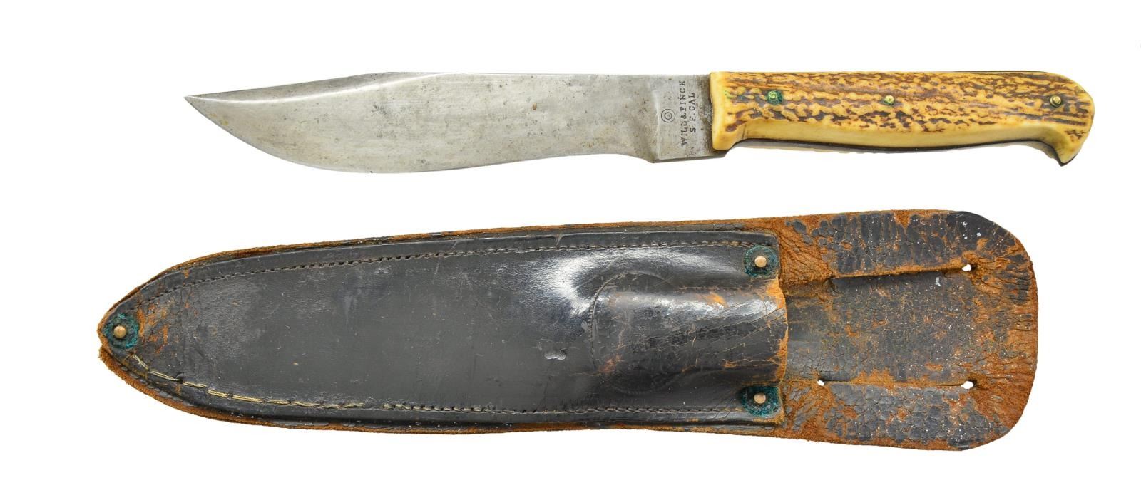 11” overall, 6.5” clip point blade that tapers out from 1” to 1.25” “WILL & FINCK / S. F. CAL” on ricasso, full tang, stag slab grips, well fit leather sheath with integral belt loop. CONDITION: very good overall, blade is gray, old sharpening, crisp makers mark. Sheath is solid, resewn open seam on one side, other side has about half seam unsewn, makers logo on sheath not discernible. (02-19369/JS). $2,000-3,000.