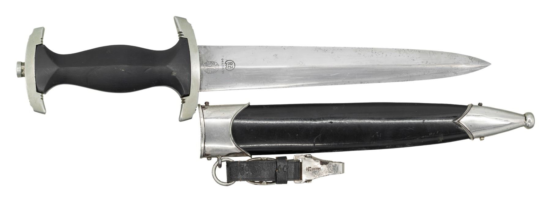 A beautiful fine condition WWII German SS dagger measuring 15 1/4' overall with an etched blade that reads "Meine Ehre Heisst Treue". The blade is marked " RZM 941/36/SS " & " CARL EICKHORN (logo) "SOLINGEN". Nickel silver crossguard and pommel guard. Black wooden grip with inset black enameled SS button and eagle. Black enameled scabbard with plated mounts and an SS proofed hanger by Assmann. CONDITION: blade shows prmarily scabbard wear. Hilt shows light wear overall. Scabbard is very nice with 99%+ finish. Hanger is lightly used and well marked. (02-26165/BF). NON-GUN. $2,500-3,500.