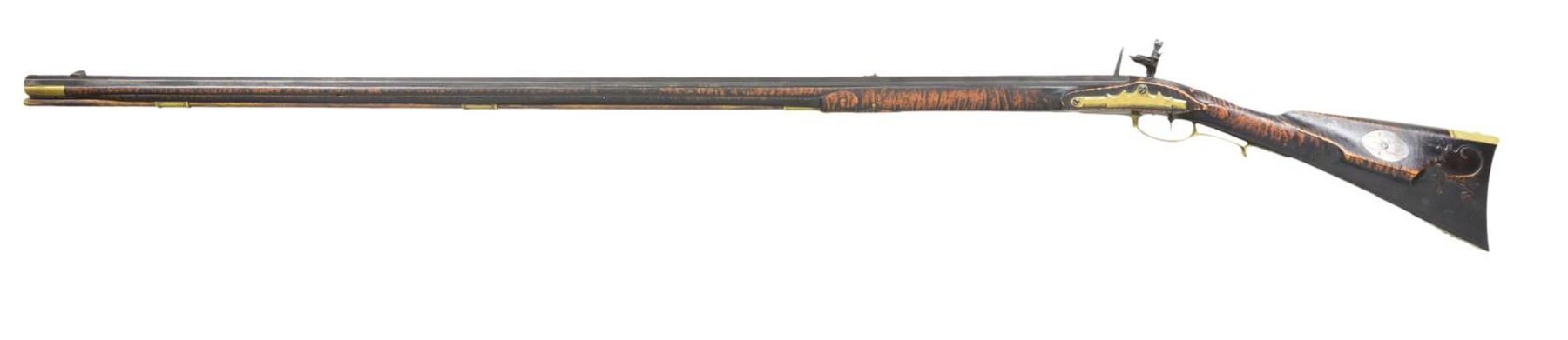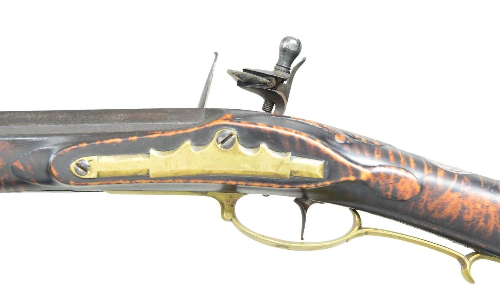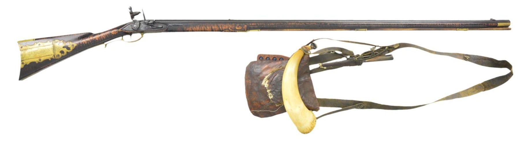 FLINTLOCK LONG RIFLE BY JUDSON BRENNAN WITH POSSIBLES BAG & EQUIPMENT. Cal. 45. S# 39. Jud Brennan is known for his exceptionally fine work recreating traditional weapons from the "Golden Age" & aging them, giving the appearance of originals. This raised carved rifle has 45" deeply swamped oct. bbl. fitted w/ U-notch rear & brass blade front sights. Top flat is engraved "J. Brennan No 39". Handmade (JB cartouche on interior) early style flintlock w/ bevelled plate features serpentine cock, inset faceted pan, bridled friction frizzen & nicely file decorated featherspring w/ heart shaped finial & teat. Fine, full length stock w/ brass tip is of dramatically quilted & curled hard rock maple & is brass mounted w/ some silver decoration. Early style broad buttplate has 2 1/2" return. Fancy patchbox w/ piercings in top is of foliate style. Trigger guard & spur are faceted & well shaped sideplate is chamferred. There is an oval silver mount above cheekpiece & a circular crestplate at top of grip is engraved w/ monogram "REW". Patchbox is engraved w/ acanthus & floral scroll, silver oval w/ more scroll & two eyes. Stock is decorated w/ raised acanthus carving behind bbl. tang, moldings around lockplate & sideplate w/ some raised carved scroll behind cheekpiece. There are incise carved wiggles above moldings along toeline. Stock is pinned to bbl. & bbl. channel is nicely molded. A plain hickory ramrod mounts through 2 faceted & beaded pipes & matching thimble. UNATTACHED ACCESSORIES: rifle is accompanied by cloth lined leather possibles bag containing 18th century style clasp knife, priming horn, oil bottle, bullet starter, turnscrew, spare flints, cast balls, & patching material. Attached to carrying strap are fine, possibly repro., powder horn, early style sheath knife, powder measure & dusting brush. CONDITION: very fine as artificially aged. Iron parts w/ dark patina showing some cleaned & silver highlights. Brass nicely toned. Wood expertly aged & somewhat rounded giving ancient appearance that is very attractive. Bore is bright & shiny. Lock is crisp. Possibles bag & accessories are in like condition. (01-21059/MGM). ANTIQUE. $3,000-4,000.