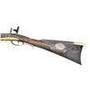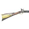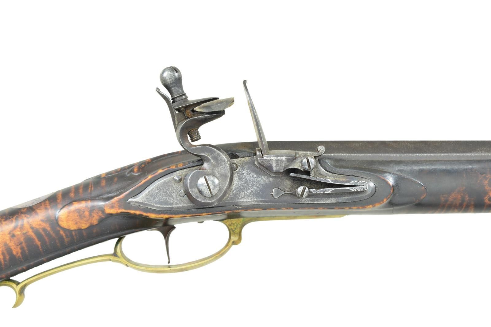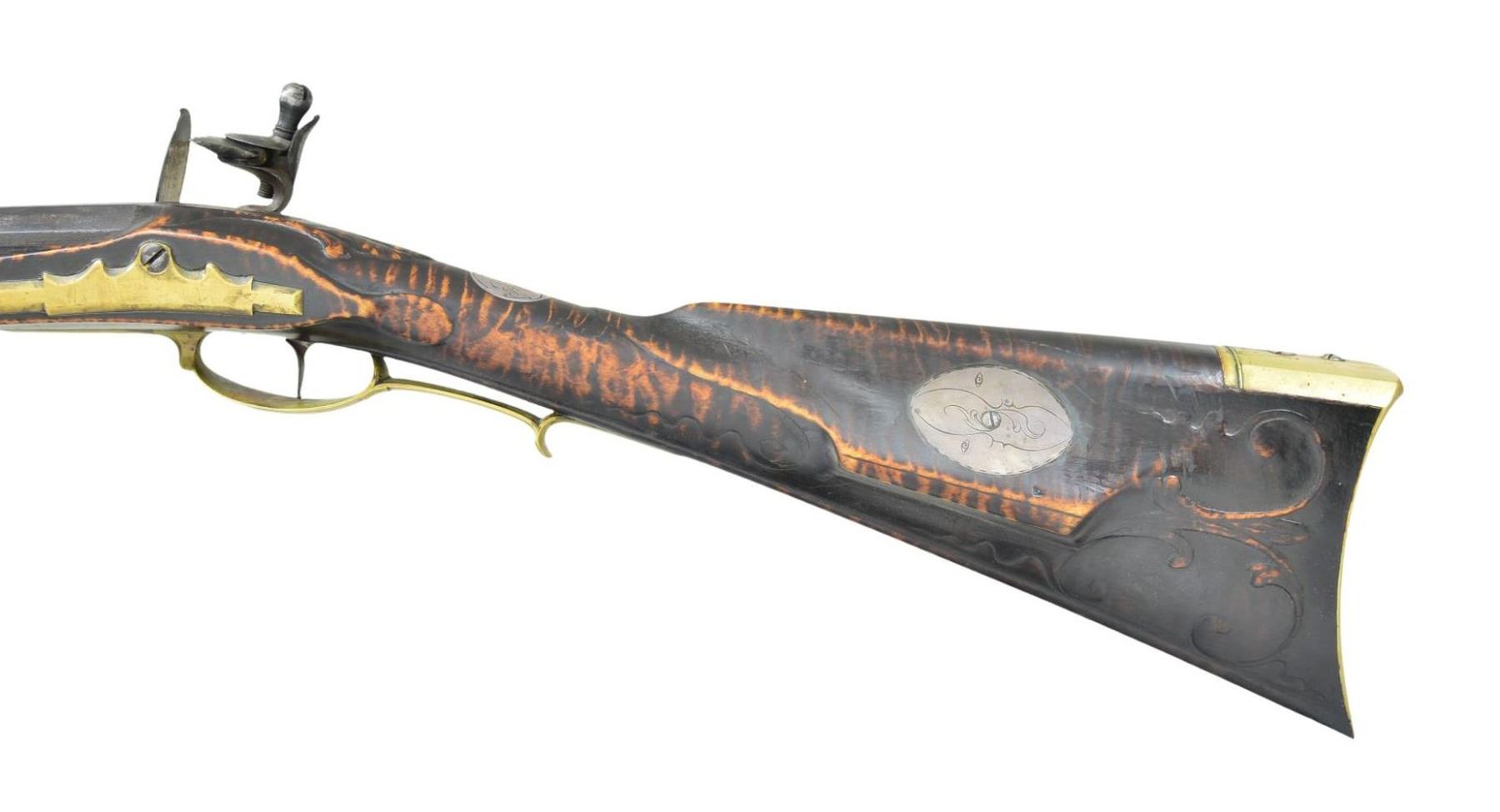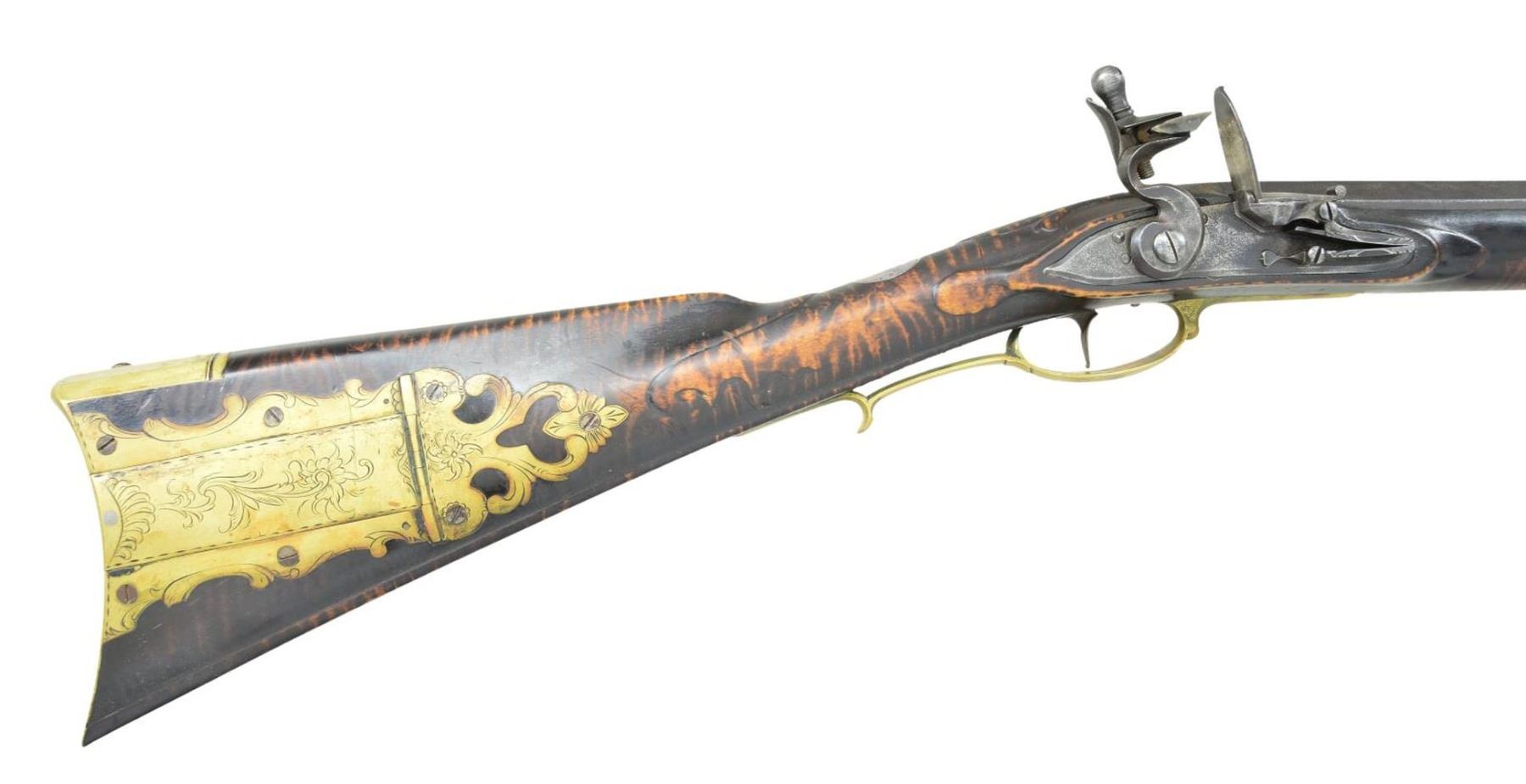 FLINTLOCK LONG RIFLE BY JUDSON BRENNAN WITH POSSIBLES BAG & EQUIPMENT. Cal. 45. S# 39. Jud Brennan is known for his exceptionally fine work recreating traditional weapons from the "Golden Age" & aging them, giving the appearance of originals. This raised carved rifle has 45" deeply swamped oct. bbl. fitted w/ U-notch rear & brass blade front sights. Top flat is engraved "J. Brennan No 39". Handmade (JB cartouche on interior) early style flintlock w/ bevelled plate features serpentine cock, inset faceted pan, bridled friction frizzen & nicely file decorated featherspring w/ heart shaped finial & teat. Fine, full length stock w/ brass tip is of dramatically quilted & curled hard rock maple & is brass mounted w/ some silver decoration. Early style broad buttplate has 2 1/2" return. Fancy patchbox w/ piercings in top is of foliate style. Trigger guard & spur are faceted & well shaped sideplate is chamferred. There is an oval silver mount above cheekpiece & a circular crestplate at top of grip is engraved w/ monogram "REW". Patchbox is engraved w/ acanthus & floral scroll, silver oval w/ more scroll & two eyes. Stock is decorated w/ raised acanthus carving behind bbl. tang, moldings around lockplate & sideplate w/ some raised carved scroll behind cheekpiece. There are incise carved wiggles above moldings along toeline. Stock is pinned to bbl. & bbl. channel is nicely molded. A plain hickory ramrod mounts through 2 faceted & beaded pipes & matching thimble. UNATTACHED ACCESSORIES: rifle is accompanied by cloth lined leather possibles bag containing 18th century style clasp knife, priming horn, oil bottle, bullet starter, turnscrew, spare flints, cast balls, & patching material. Attached to carrying strap are fine, possibly repro., powder horn, early style sheath knife, powder measure & dusting brush. CONDITION: very fine as artificially aged. Iron parts w/ dark patina showing some cleaned & silver highlights. Brass nicely toned. Wood expertly aged & somewhat rounded giving ancient appearance that is very attractive. Bore is bright & shiny. Lock is crisp. Possibles bag & accessories are in like condition. (01-21059/MGM). ANTIQUE. $3,000-4,000.