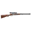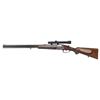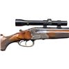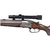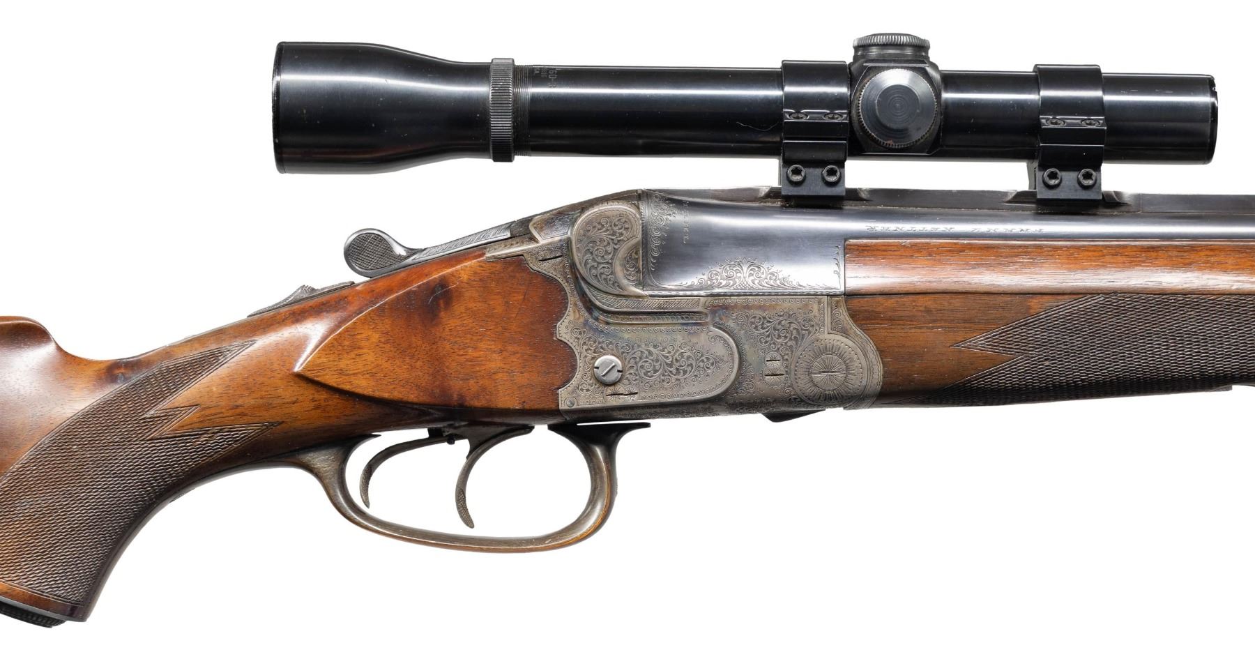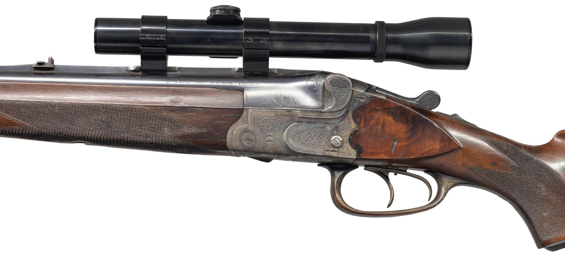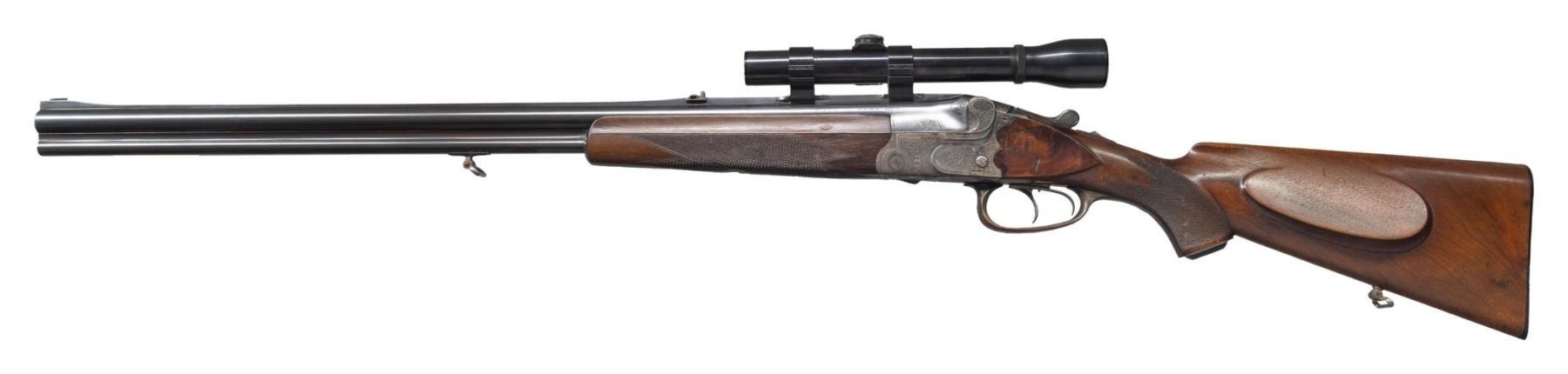 FRANZ KETTNER WITH SCOPE. Cal. 16 Ga. 2-9/16"/8x60JR. S# 3012. The 25-5/8" demi-bloc barrels are fitted with full length solid matted rib holding one standing, one folding "V" notch rear and silver bead front sights along with dovetails at rear for scope mounting. Maker's name and address are on either side of rib at rear. Barrel flats are stamped with March 1929 German nitro proofs for 16 gauge and 8x57JR rifle cartridge. Left side of rifle barrel is stamped with S# and "KAL 16-8X60R". Case hardened scallop back O/U double Kirsten action features tang safety, intercepting safety sears, raised rib tumbler end cocking indicators and double triggers (front set). Action is engraved with near full coverage very cleanly cut and shaded varying size scroll within line and geometric borders. Trigger guard is horn and tang extends to engraved steel grip cap. Bottom is relief gold inlaid with the monogram "SA". Relatively plain European walnut capped pistol grip buttstock measures 14-1/4" over ribbed horn buttplate and features shadow line right hand cheekpiece, point pattern grip checkering and sling loop on toeline matching loop found on bottom barrel. Matching one piece forend has Deeley release. Rifle is fitted with Weaver K 2.5 scope with cross hair and post reticle in Weaver clamp on rings. MEASUREMENTS: BBLS: Bore Diameter: O .672. Restriction: O .030 (full). Wall thickness: O .029. STOCK: LOP: 14-1/4". WEIGHT: 7 lb. 5 oz. (with scope). CONDITION: fine, original. Barrels retaining about 90% original blue with high edge wear. Action retains most of its case hardening color with some dark splotches from carefully cleaned rust. Stocks retain nearly all of their oil finish with a good scattering of marks. Checkering is moderately worn and has some dents and missing diamonds. Bores are fine. Action is tight. Mechanically good. Scope is also fine; slightly cloudy. (25-5024/MGM). CURIO. $2,000-3,000.