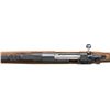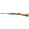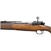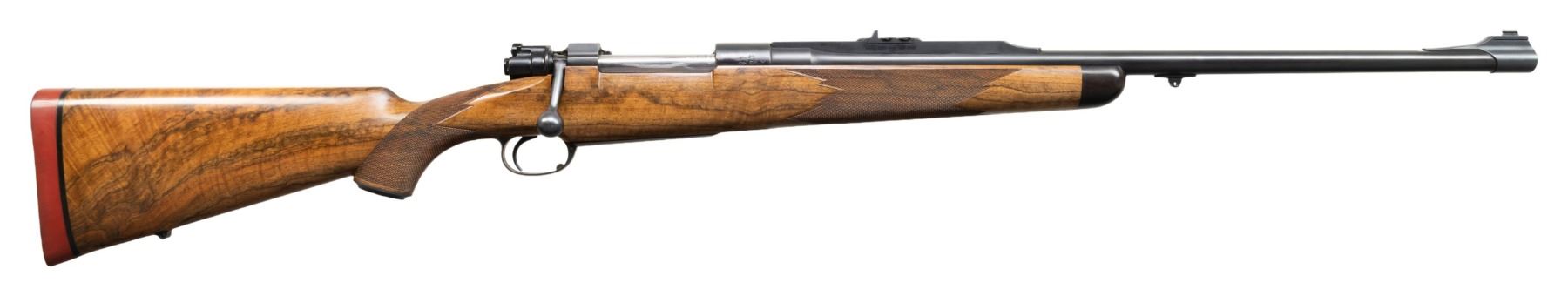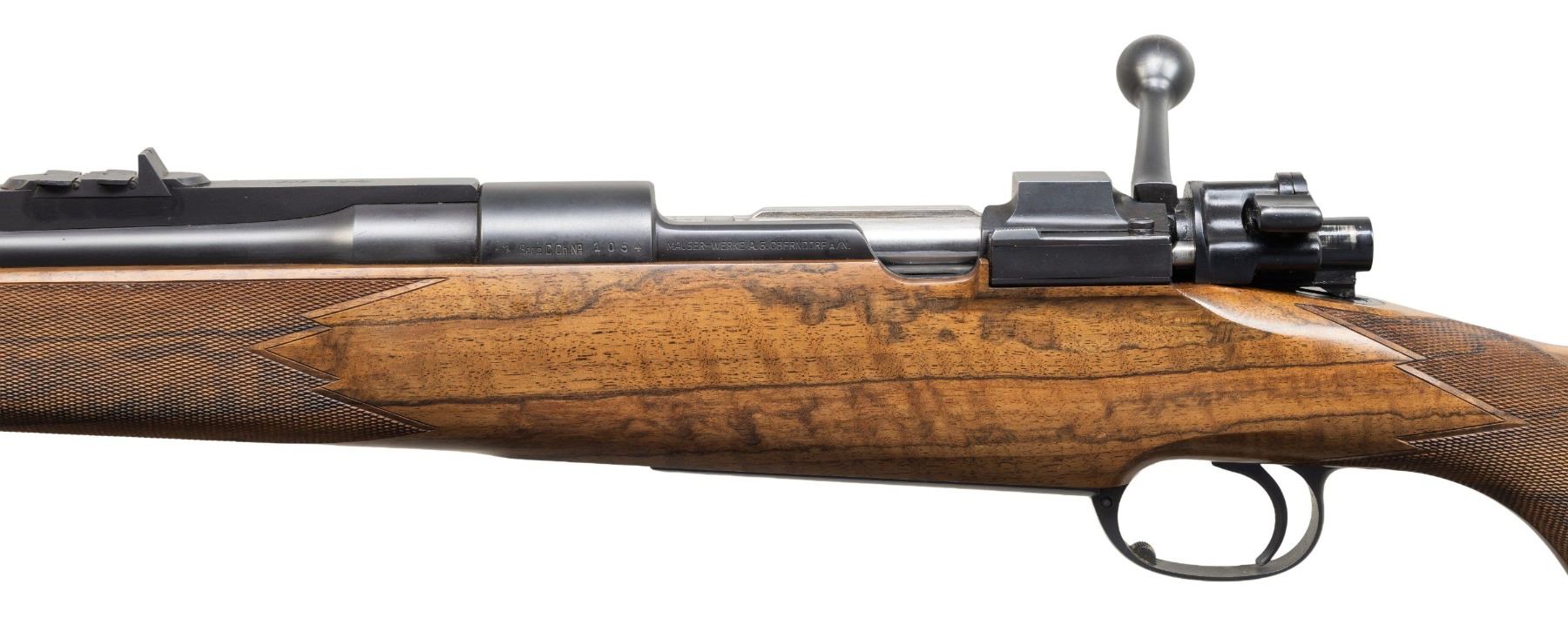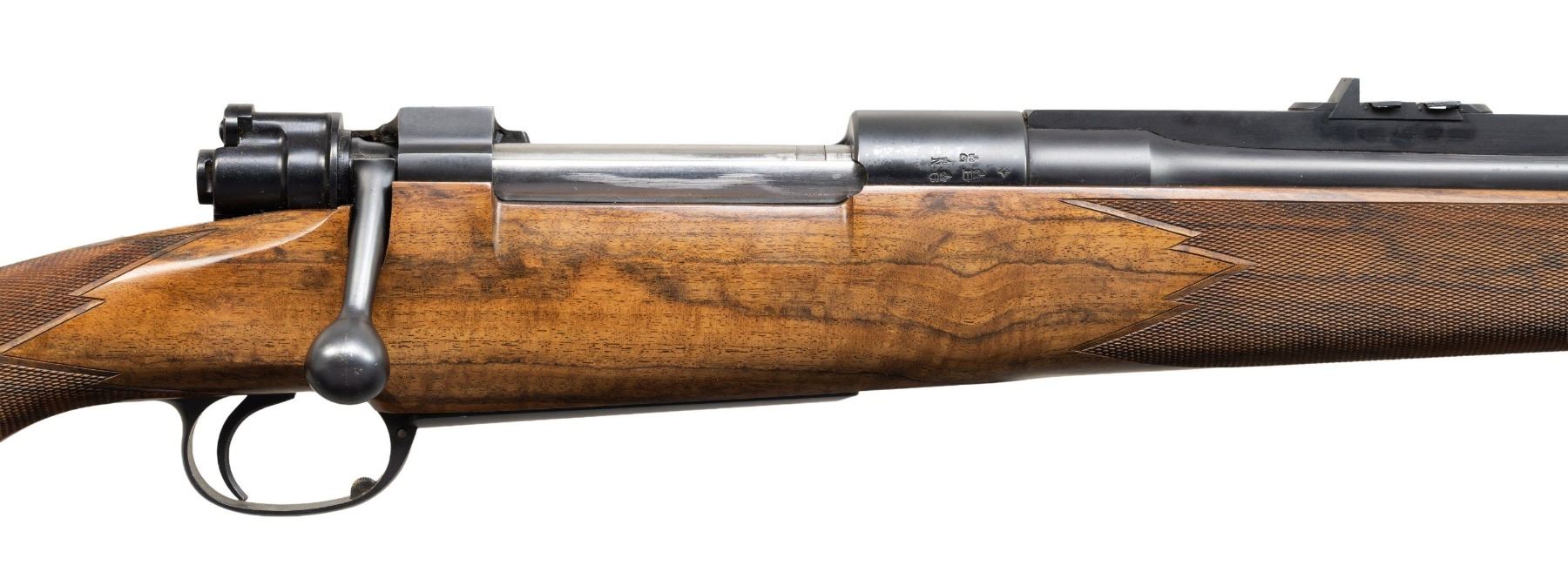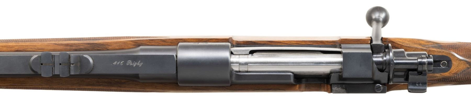 BY NATE BISHOP. Cal. 416 Rigby. S# C.Ch. No 1054. Nate Bishop was a custom riflesmith who started working in the 50's & 60's and was one of Elmer Keith's favorites. This fine rifle, possibly one of Nate's last, is marked "Show Gun by Nate Bishop 3/87" in barrel channel. It has 24" medium weight round barrel fitted with quarter rib holding one standing, two folding leaf express rear sight which is marked with caliber at rear. Banded on front ramp holds silver bead. Sling eye is soldered to bottom of barrel. Large ring standard length model 98 Mauser action sourced from a Chilean carbine has S# and "BU" proofs on receiver ring. Mauser Oberndorf markings are on side wall. Action has been altered to accept long 416 Rigby cartridge and a square bridge is added. Bolt has had new handle with pear shaped knob added and a commercial trigger is fitted. Custom drop box bottom metal with hinged straddle floorplate has release button in trigger guard bow. Crisply shaped trap steel capped pistol grip stock made from a piece of very finely marbled and somewhat fiddle figured French walnut measures 14" over Silver type leather faced pad. Squared and swept shadow line cheekpiece, bolt stop surround, sling eye pedestal base on toeline and cartridge ejection port are very cleanly shaped. Superbly executed multi-point pattern checkering at grip and around forend is partially borderless with remainder very neatly mullered. Stock has rosewood forend tip and hand rubbed oil finish is exceptionally fine. CONDITION: very fine; close to "new" as custom finished with only a few minor handling marks on wood and metal. Bore is bright and shiny. Mechanically fine. PROVENANCE: From the Buckstix Collection. (25-6460/MGM). MODERN. $4,000-6,000.