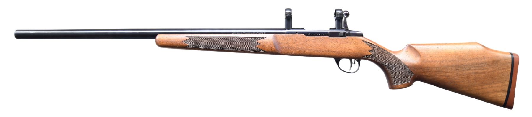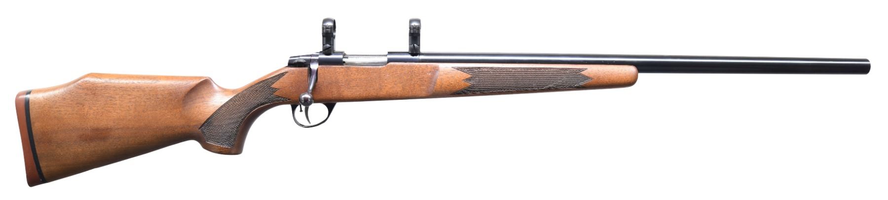 RIFLE. Cal. 6mm PPC. S# A486. Imported 1989-1997 by Stoeger. Barrel 23.75" without sights. Single shot action with grooved receiver; Tall 1" rings on grooves. Checkered walnut stock with red pad. CONDITION: Near excellent wood & metal finish showing scattered light dings or marks. Very good plus shiny bore with strong rifling. (25-1560/MD). MODERN. $800-1,200.