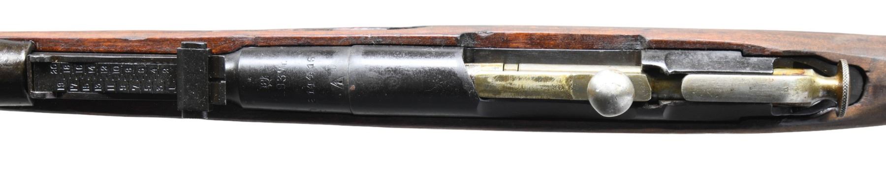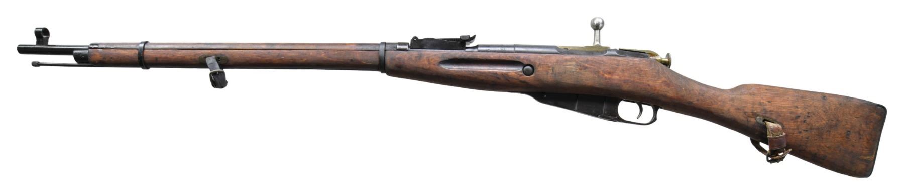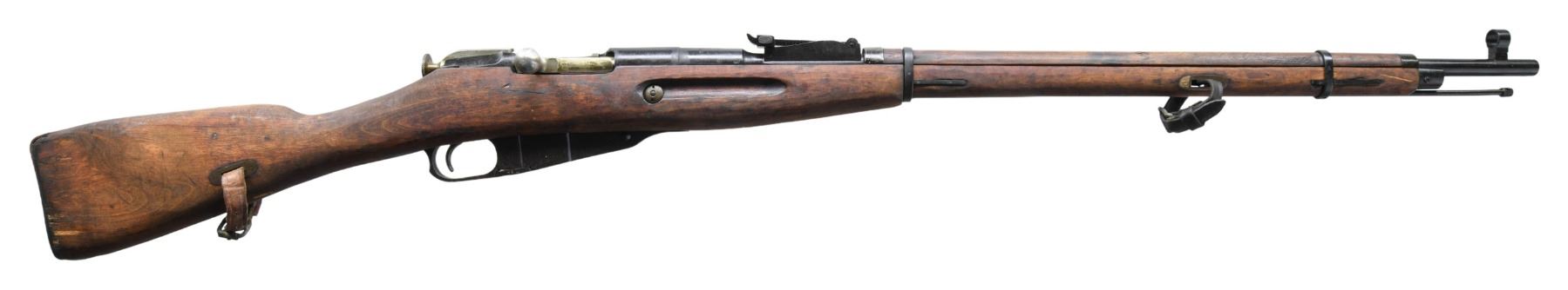 RIFLE. Cal. 7.62x54R. S# 214416. Bbl. 29" with Century import marking. Post front sight with hood. Tangent rear sight graduated to 2000m. Bolt knob has been renumbered to match by Finns, other parts are mismatched. Bbl. shank has 1937 date, Izhevsk & Finnish "D" markings. Left side of bbl. has boxed "SA" Finnish Army marking. Arsenal blue finish. Hardwood stock with screw in sling slots & leather hangers. Cleaning rod. CONDITION: stock set has Finnish arsenal rework appearance with a couple small armorer repairs, some worn finish, dings & handling marks. Metal retains 85% arsenal rework blue with some notable oxidation on buttplate, scattered further lighter oxidation, edge & handling wear. Action functions properly when hand cycled. Bore shows light pitting & frosting but strong rifling. (25-3747/MJC). CURIO. $200-400.