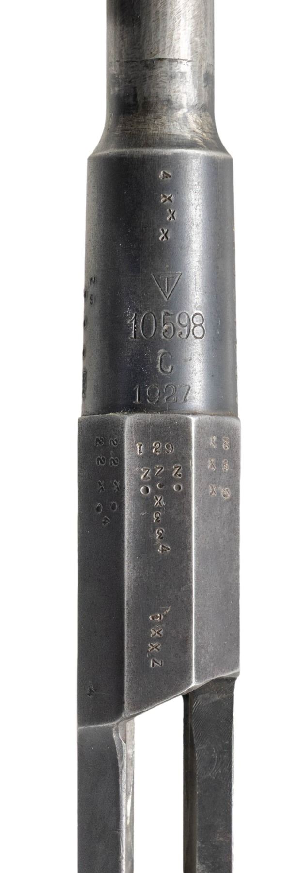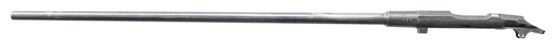 Cal. 7.62x54R. S# 10598. Bbl. 28 1/2" that appears slightly shortened. Stripped Tikka 1891 Mosin Nagant barreled action. Receiver & bbl. are only parts present. Front & rear sight screws are vacant with two at front & two at rear. Receiver tang date not visible. Bbl. shank has Tikka markings, "D" marking & 1927 date. Right side of bbl. has "SS145626" number possibly Civil Guard. Receiver & bbl. also have several small "X'd" out numbers included a canceled army "SA" stamp. Blued finish. CONDITION: metal shows wear where sights used to be, scattered fading to gray, edge wear & oxidation. Bore shows scattered frosting & some pitting but strong rifling. (25-3067/MJC). MODERN. $75-150.
