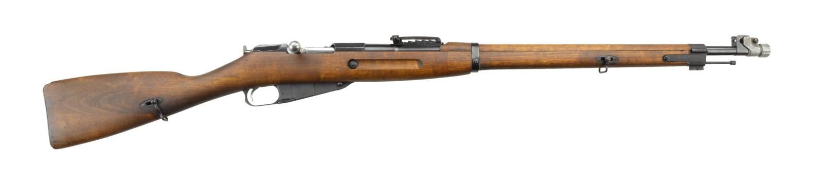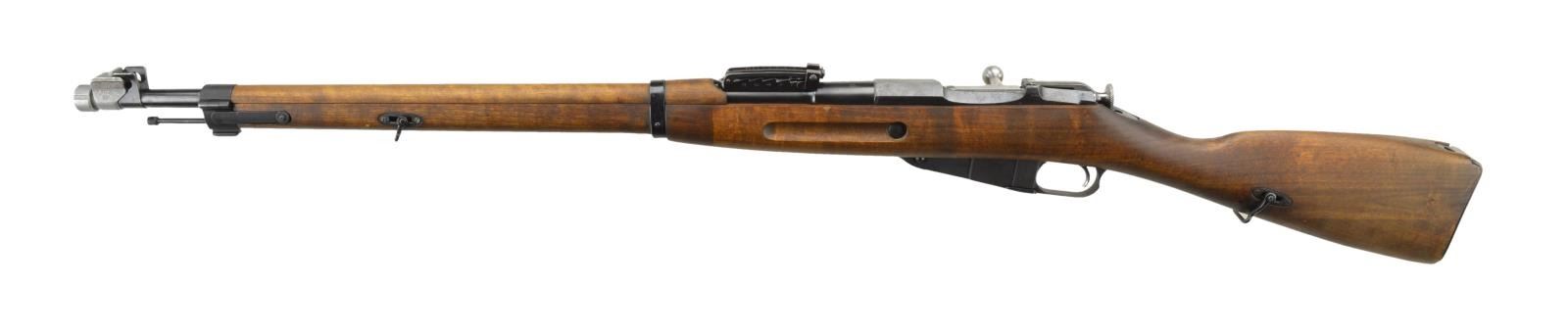 Cal. 7.62x54R. S #82134. Bbl 27" w/ import marking. Serial number matches on bolt knob & bbl. Straight bolt handle. Hex receiver marked with Czarist eagle. Bbl. marked on top over chamber w/ "T" inside triangle Tikka marking & 1935 date. Tangent rear sight graduated to 3200 Arshins. Blade front sight w/ protective ears. Cleaning rod is present. Bottom sling swivels. Hardwood straight grip stock w/ 2 piece finger joint construction under rear sight. UNATTACHED ACCESSORIES: two piece "SA" marked muzzle cover. CONDITION: handguard shows a 3" crack behind front band, stock has some handling marks & minor dings. Metal retains 95% arsenal rework blue with minor silvering on the receiver and magazine body, as well as some blued over pitting. Very good shiny bore. (22-2328/MJC) CURIO $300-500