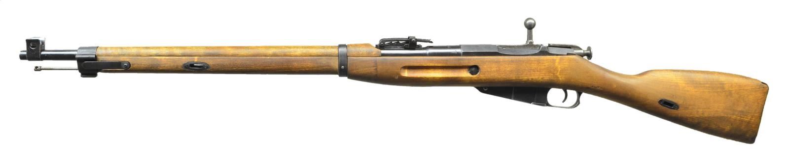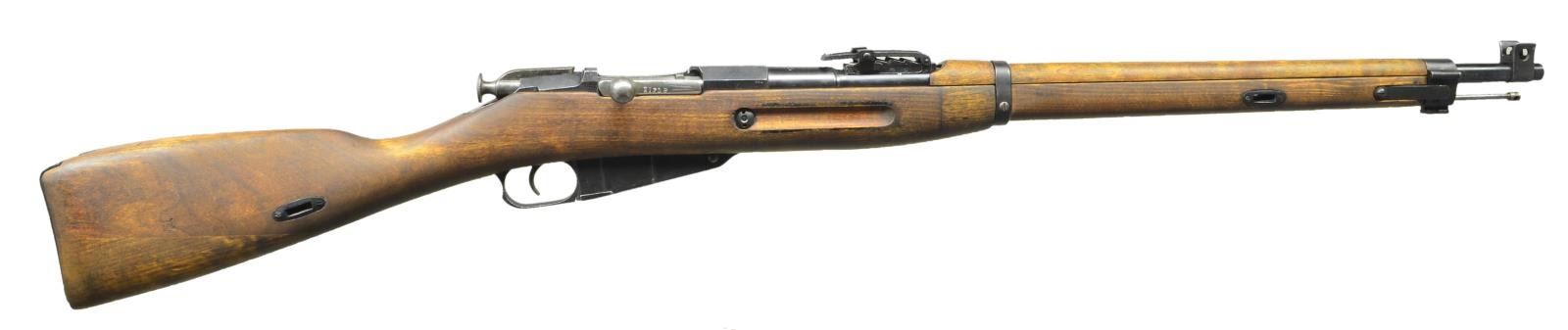 Cal. 7.62x54R. Ser. #80415 matches on bbl. & bolt. Bbl. 27". Hex receiver is unmarked. Machine marks on top flat indicate removal of original receiver markings. Bbl. is marked on top w/ "T" in triangle indicating mfg. by Tikkakoski Oy. "D & F" dated 1934 marked on left side with boxed "SA" . Straight bow handle. Rear sight graduated to 800 meters. Blade front sight w/ protective ears. Cleaning rod is present. Hinged nose cap w/ screw on right side. Bayonet reinforcing braces are present. Trigger guard has tiny IZHEVSK arsenal marking. Hardwood stock & handguard. Buttstock has Arms depot mark "L" on right side. Stock has Finnish finger jointed construction w/ 2 piece buttstock, fitted w/ sling slots. CONDITION: stock has lg. percentage of original finish w/ staining & scattered handling marks. Metalwork has 75% original finish w/ thinning & light wear. Bolt turning gray w/ light oxidation. Bore is shiny w/ moderately worn lands. (22-4045/RW) CURIO. $300-500.