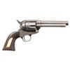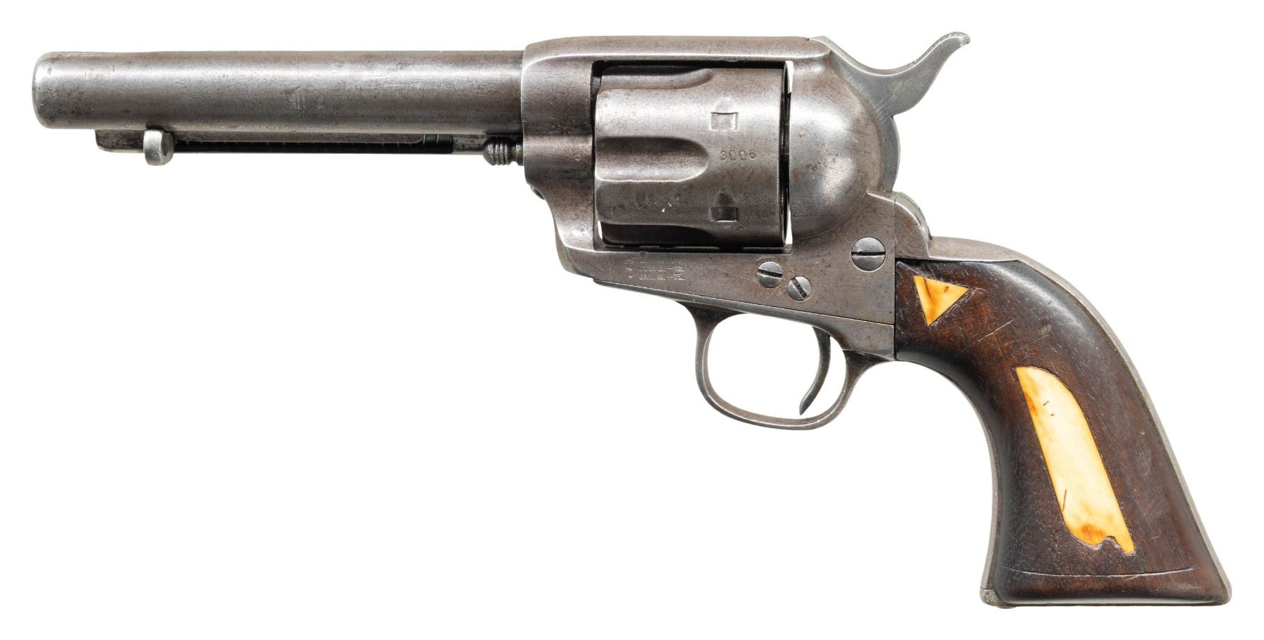 ACTION ARMY FRONTIER SIX SHOOTER REVOLVER. Cal. 44 CF (44-40 WCF). S# 103006. Bbl. 5 1/8". First Generation black powder frame Single Action Army Frontier Six Shooter mfg. by Colt in 1884. Left side of the bbl. is blank (acid etched panel has worn off), with Colt's single line address marked across the top, and "44" marked on the underside towards the breech. Left side of the frame is marked with Colt's 3-line patent information. Left side of the forward trigger guard web is marked "44.C.F.". Frame is mounted with a 1-piece wood grip, featuring an oblong natural white insert on either side, with an additional triangular natural white insert also present on the left. Grip has been sanded and refinished at one time. Bbl. has been shortened, with the front sight having been removed. Standard frame notched rear sight. Oval type ejector rod head. All serialized parts are matching and include the frame, cyl. (side), trigger guard, and rear grip strap. Bbl. is unnumbered. CONDITION: metal components have faded to a mottled gray patina, showing scattered scratches and superficial handling marks, with light to mild pitting present overall. Bore is relatively bright, exhibiting consistent mild pitting, while retaining good, albeit worn rifling throughout. Action is worn, with the hammer not setting in the rearmost position, but otherwise exhibiting proper manual mechanics, with slight cyl. play. Cyl. base pin bushing exhibits a notable chip. Grip show scattered superficial handling marks, several intentionally cut lines, as well as a chip on the left side above the triangular inlay, but otherwise remains sound. Inlays exhibit a pleasing yellowed patina. (01-26693/MLW). ANTIQUE. $1,200-1,500.