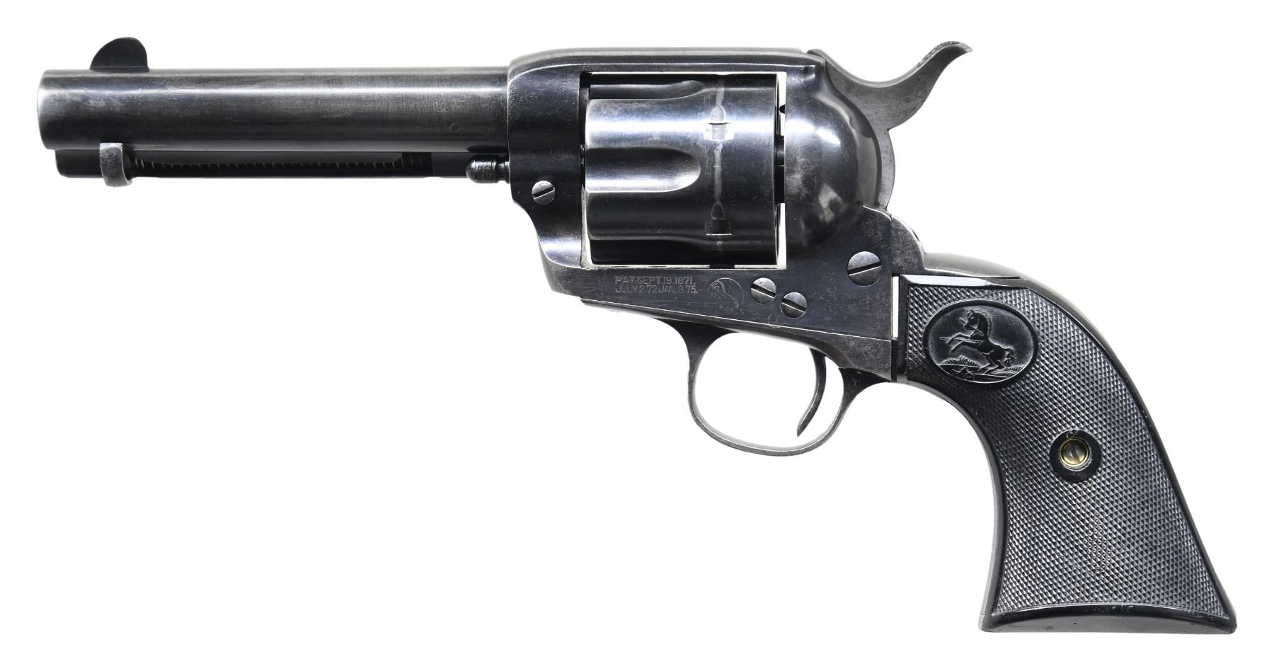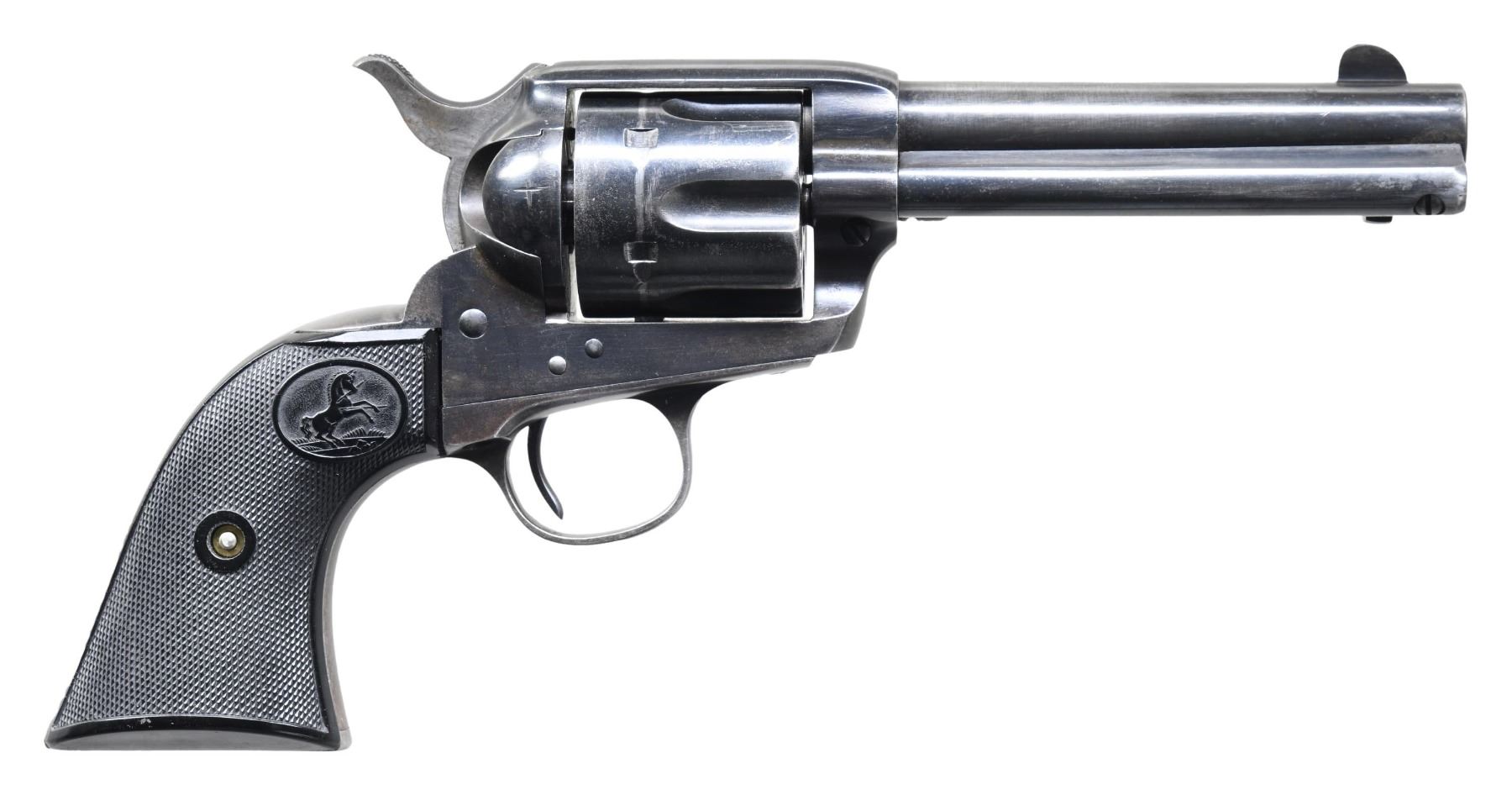 Cal. 38 WCF (38-40). S# 290729. Bbl. 4 3/4", with blade sight. 6-shot fluted cyl. Frame and grip straps have matching S#s. 2-piece checkered hard rubber Rampant Colt grips that appear to replacements. Mfg. in 1907. CONDITION: 60% dull thinning reblued finish, showing a wide cyl. dragline. Bbl. and frame markings are weakened. Loading gate is marked with a cut cross. Grips show light wear and marks. Action is out of time, cyl. stops short of locking when action is cycled. Lightly pitted bore has worn rifling. (25-2688/DS). CURIO. $800-1,200.
