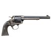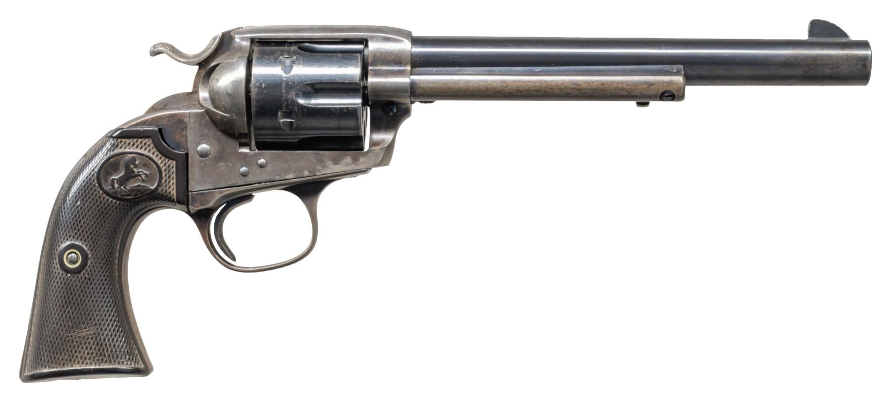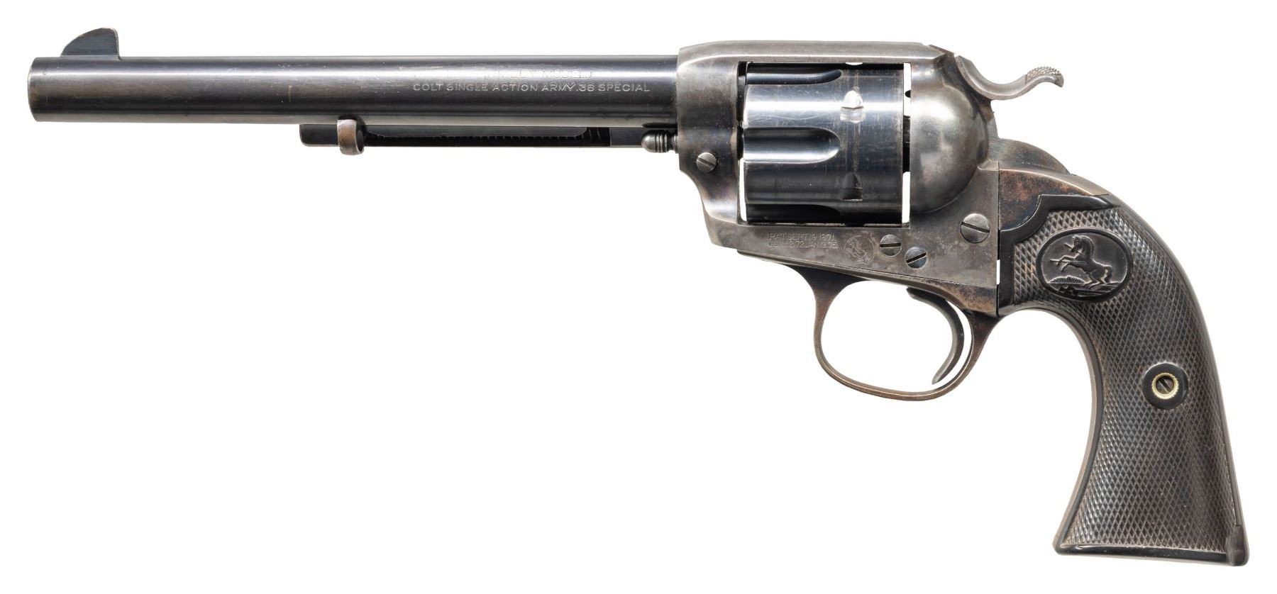 MODEL REVOLVER. Cal. 38 Special. S# 284431. Bbl. 7 1/2". Single Action Army Bisley Model revolver mfg. by Colt in 1906. Left side of the later production replacement bbl. is marked "(BISLEY MODEL)/ COLT SINGLE ACTION ARMY .38 SPECIAL", with Colt's single line address marked across the top. Left side of the frame is marked with Colt's 2-line patent information, followed by the encircled Rampant Colt logo. Frame, loading gate, and hammer exhibit a case colored finish, with remaining metal components exhibiting a blue finish overall. Frame is mounted with 2-piece Colt checkered brown hard rubber grips. Standard SAA pattern blade front sight and frame notched rear sight. All serialized parts are matching and include the frame, trigger guard, and rear grip strap. Grips are matching via "4431" which is lightly inscribed on the interior of the panels. Cyl. is unnumbered. CONDITION: frame, loading gate, and hammer retain trace to fair amounts of their original case colored finish, with the balance fading to a mottled gray patina, showing scattered spots of light surface oxidation. Bbl. retains the majority of its original blue finish, showing some areas of wear and thinning that are fading to gray, as well as some scattered superficial handling marks overall. Ejector rod housing, trigger guard, and rear grip strap have largely faded to a gray/brown patina. Near mirror bore, retaining well defined rifling throughout. Proper manual mechanics, although the cyl. does rotate slightly counter clockwise when hammer is down. Grips show moderate smoothing and scattered superficial handling marks, with the left panel exhibiting a chip at the bottom right corner, and the right panel exhibiting 2 large chips on the butt. (25-1218/MLW). CURIO. $2,000-3,000.