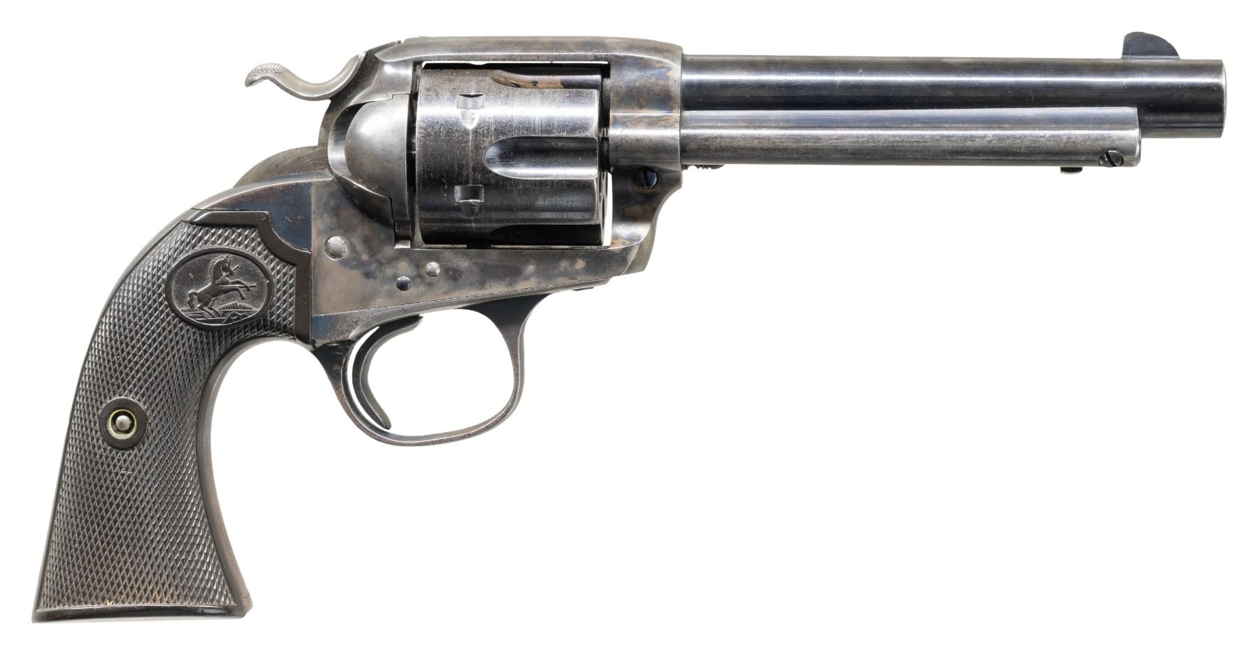 MODEL REVOLVER. Cal. 32 WCF. S# 326676. Bbl. 5 1/2". Single Action Army Bisley Model revolver mfg. by Colt in 1913. Left side of the bbl. is marked "(BISLEY MODEL) 32 W.C.F.", with Colt's single line address marked across the top. Left side of the frame is marked with Colt's 2-line patent information, followed by the Rampant Colt logo. Frame, loading gate, and hammer exhibit a case colored finish, with remaining metal components exhibiting a blue finish. Frame is mounted with 2-piece Colt checkered brown hard rubber grips. Standard SAA pattern blade front sight and frame notched rear sight. Matching numbers are present on the frame, trigger guard, and rear grip strap. Grips are matching via a hand inscribed "6676" on the interior of the panels. Matching assembly # "561" is present on the frame and loading gate. CONDITION: frame, loading gate, and hammer retain fair amounts of their original case colored finish, showing areas of wear that have faded to gray patina. Blued parts retain large amounts of their original finish, showing edge wear and areas of wear that are fading to gray patina, with some scattered spots of light surface oxidation. Grip straps have faded to a mottled gray patina. Bright bore, exhibiting scattered spots of light pitting and a small spot of dark pitting, while retaining well defined rifling throughout. Proper manual mechanics, with tight lock up. Grips show light smoothing and some scattered superficial marks from handling and storage, but otherwise remain sound. PROVENANCE: The Esteemed Norm Greenberg Collection. (25-4187/MLW). CURIO. $1,200-1,800.