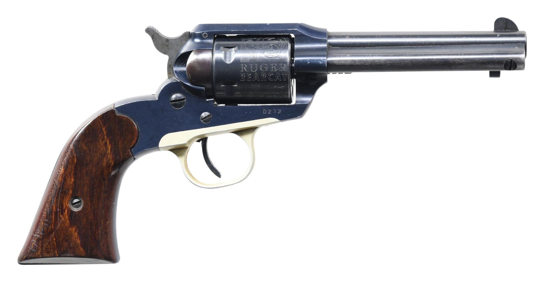 REVOLVER WITH CORRECT ERA BOX. Cal. 22 S, L, LR. S# D232. Mfg. 1958 within S# range A001 to F482 (approx 12,000 mfg.). The 4" barrel is marked "STURM, RUGER & CO / SOUTHPORT, CONN." having Ruger eagle logo. Tall serrated blade front sight with fluted sides; top strap has sighting groove. Steel ejector rod housing with flat faced ejector rod head; concave face ejector rod button was seen on guns S# range A002 to M393. Roll engraved 6 shot cyl. with scene showing a bear & cougar with "RUGER / BEARCAT". Black anodized alloy frame. Brass colored anodized triggerguard. Two piece plastic impregnated grips. UNATTACHED ACCESSORIES: correct period black & red box with number "e578" written on label end. Box in good condition showing fraying & wear commensurate with age. Box contains portion of warranty card & Ruger "Bearcat" revolver instructions & parts list. CONDITION: very good barrel blue with series of deep scratches on bottom & couple of spots of pinprick patina. Good plus ejector rod housing blue with streaks of finish loss. Very good black finish on frame with areas of edge wear along with pinprick finish loss & 1 sm. dent on butt. Very good cyl. finish with edge wear. Loading gate has plum tone with wear. Polished hammer sides shows cleaned patina. Very good grips with series of light scratches on right panel. Good plus triggerguard with light patina. Very good bore with strong rifling. (25-1568/MD). CURIO. $500-800