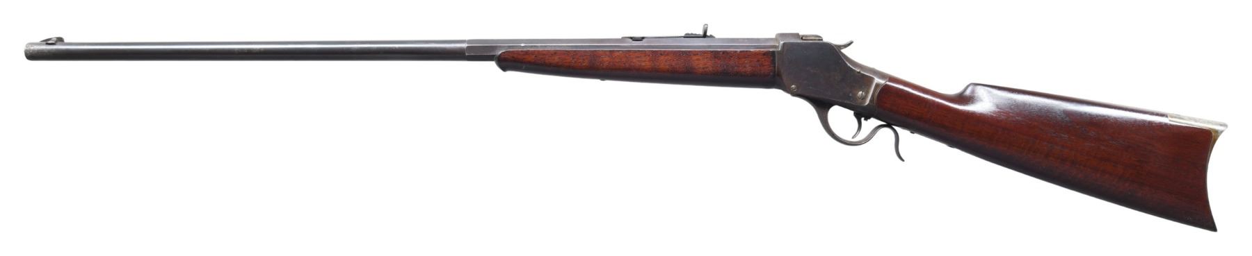 HI WALL SINGLE SHOT RIFLE. Cal. 32 WCF (32-20). S# 392. Bbl. 28" octagon to rnd. of No. 1 weight. Rocky Mountain front sight, with sporting rear sight. Thin wall receiver, with stock and forearm flares. Single set trigger. Ebony tipped walnut forearm and straight grip stock, with crescent steel buttplate. Mfg. in 1885, first year of production. CONDITION: metal finish has faded brown appearance, showing small dents and marks, with spots of light surface corrosion. Sanded wood has a good refinish. Trigger will not set, adj. screw is a replacement. Bore shows small spots of very light pitting and retains sound rifling. PROVENANCE: Estate of Russell Dickerman. (01-27100/DS). ANTIQUE. $800-1,200.