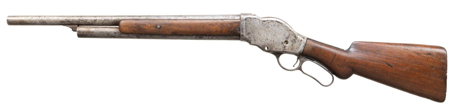 LEVER ACTION SHOTGUN. Cal. 10 GA. S# 5620. Bbl. 20 3/4". Model 1887 lever action shotgun mfg. during the first year of production (1887). Left side of the receiver is marked with Winchester's "WRA" Co. monogram, with Winchester's mfg. and patent information marked on the lower tang. 2-panel plain wood forearm and rnd. knob buttstock have been sanded and refinished. Buttplate is absent. Bbl. has been shortened, with the bead being absent. Hammer assembly and various other internals are absent, including the lower lever screw. CONDITION: metal components exhibit a mottled gray patina, with scattered spots of light to mild pitting present overall. Receiver is cracked at the rear of left edge of the hammer slot, and exhibits an additional crack that stems from the right rear edge of the hammer slot that runs down the right side of the receiver. Bore exhibits a consistent scattering of moderate pitting. Forearm panels show scattered marks and impressions, with numerous chips present along the edges. Buttstock exhibits numerous cracks with notable chipping present on and around the toe area. (01-28205/MLW). ANTIQUE. $100-300.