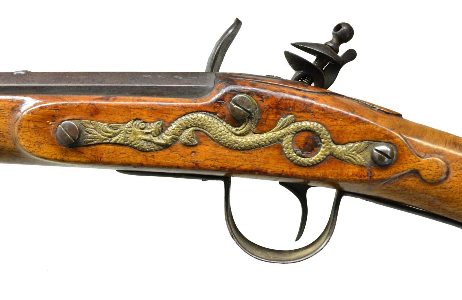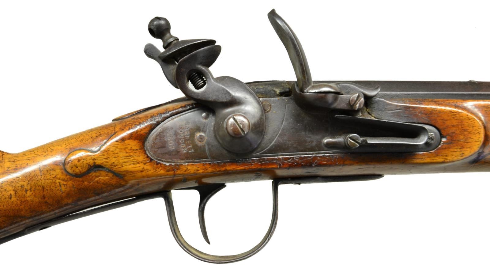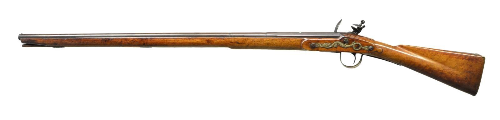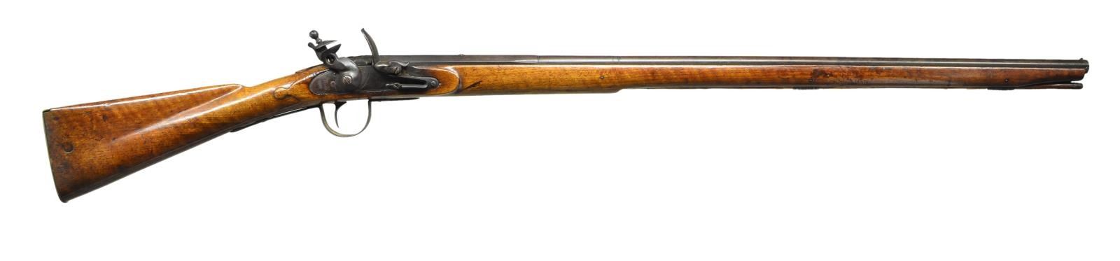 Cal. 57. NSN. Trade guns by Barnett are the most common by far. The 34 1/2" octagon to round barrel has London proofs on top left flat at rear which is also stamped with the initials "JEB" and some other unknown marks. A lead rear rifle sight has been added. Tombstone fox stamp is on top flat and on flintlock with rounded plate fitted with reinforced cock, integral rounded pan, bridled frizzen and feather spring with dog nose finial. Tail of lock is marked "BARNETT" "LONDON" "1867". Curly walnut stock extends to muzzle and is fitted with brass buttplate held by five screws, oversized trigger and steel trigger guard, as well as classic sea monster sideplate affixed by three large screws. Lockplate, sideplate and barrel tang are accented by carved moldings. Circular fox stamp is on left side of butt. Hickory ramrod mounts through two multi beaded brass pipes and simple hole in stock as thimble. CONDITION: very good to fine, original "as found". Iron parts retaining overall brown patina with some scattered pits. Stock retains most of all its original finish with good hand wear at normal carry points. Dark bore is pitted. Lock good. PROVENANCE: From the Lifelong Collection of Glen E. Mattox. (01-22561/MGM). ANTIQUE. $2,000-3,000.