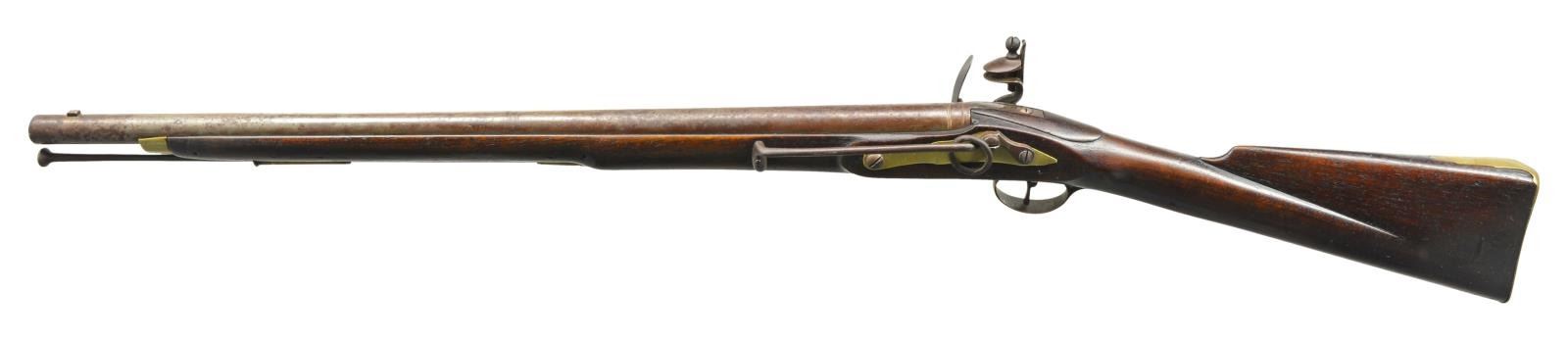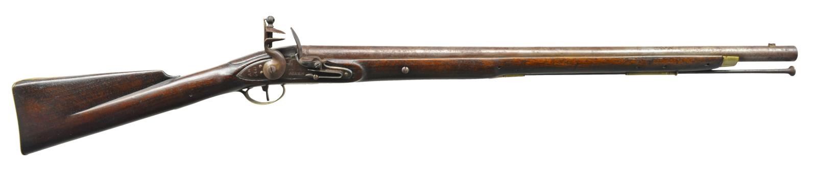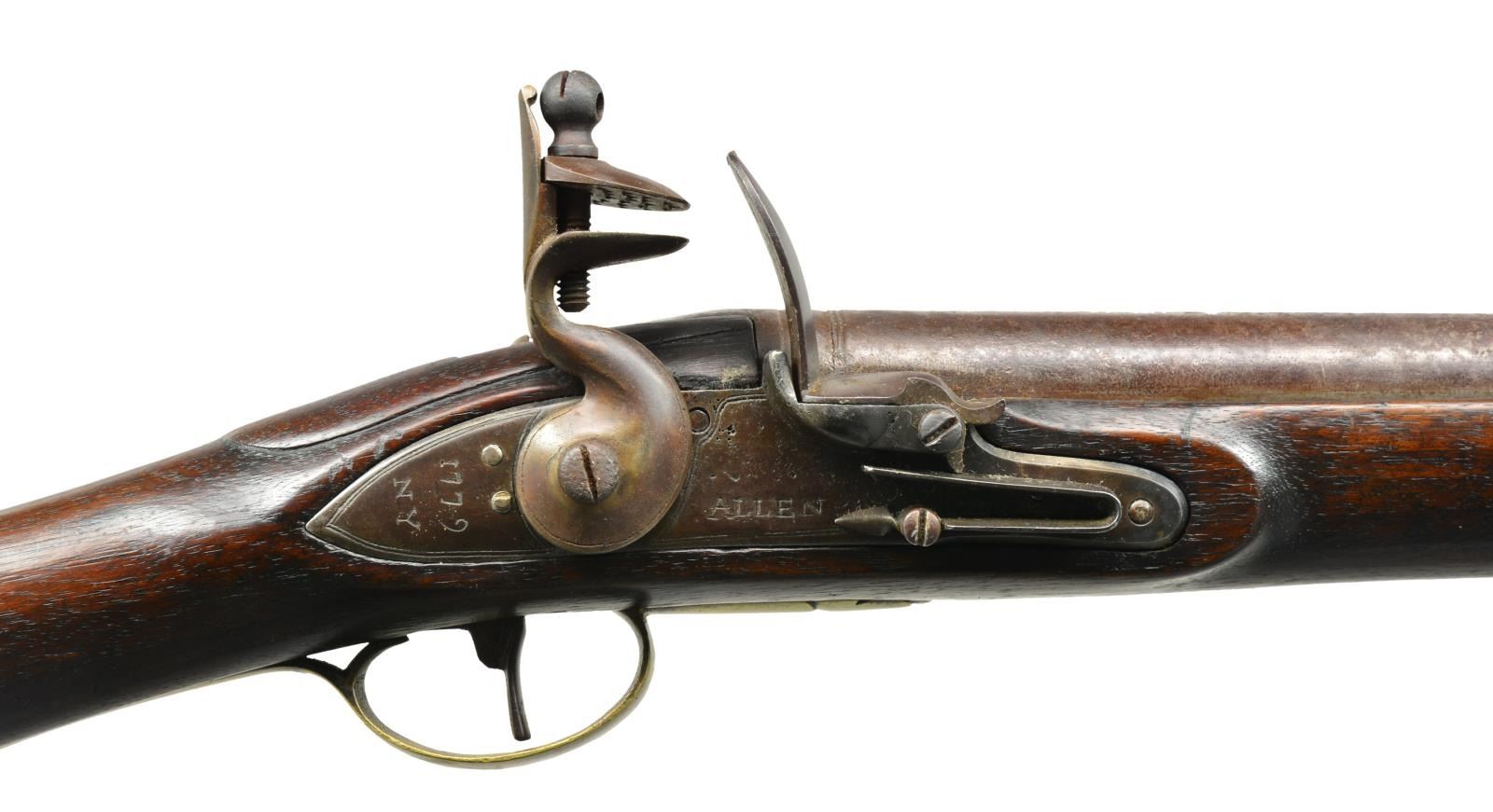 Cal. 69. NSN. 42 1/4" Overall. Bbl. 27" rnd. w/ bayonet lug on top. Lock has spurious markings “ALLEN”, “1779 / NY”. UNATTACHED ACCESSORIES: collector notes. CONDITION: good to very good overall, metal has an artificial brown patina overall, nosecap added, reconversion to flint w/ replaced cock & battery, stock is refinished. PROVENANCE: From the Collection of John "Tim" Breth Jr. (01-17775/JS). ANTIQUE. $400-700.