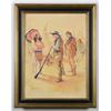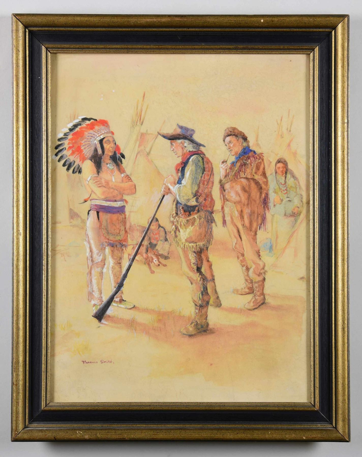 FRONTIERSMAN WITH CHIEF. Watercolor on artist board features teepees, mountaineer, and Native Americans. Signed lower left and housed in gold and black molded frame under glass. SIZE: overall 24" x 19", sight 20" x 15". CONDITION: good original condition. PROVENANCE: Martin Lane Historic & Western Americana Lifetime Collection. (02-21582/TG). $400-600.