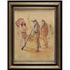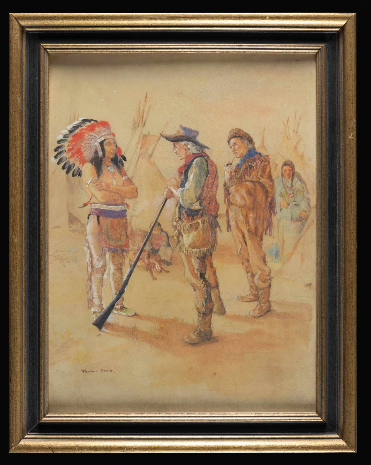 FRONTIERSMAN WITH CHIEF. Watercolor on artist board features teepees, mountaineer, and Native Americans. Signed lower left and housed in gold and black molded frame under glass. SIZE: overall 24" x 19", sight 20" x 15". CONDITION: good original condition. PROVENANCE: Martin Lane Historic & Western Americana Lifetime Collection. (02-24354/TG). NON-GUN. $200-400.