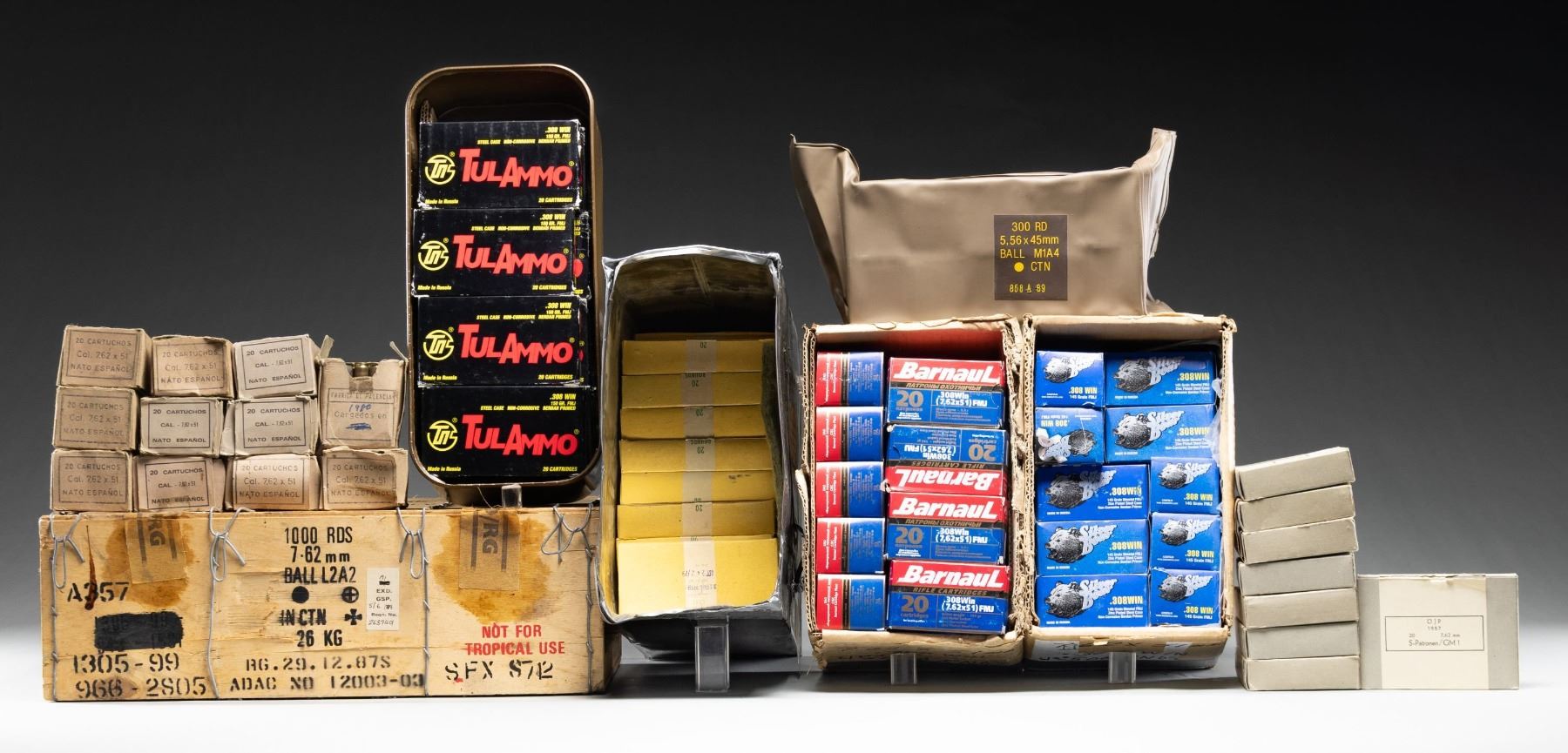 Approximately 3,660 rounds; all in near excellent condition with copper plated bullets and post WW-II production. All in 20 round boxes unless noted. 25 boxes 308 Win. Russian Silver Bear Non-Corrosive Berdan primed zinc plated steel cases with 145 grain bullets. / 28 boxes 308 Win. Russian Barnaul with same specs as previous ammo. / 16 boxes 308 Win. Tula steel cased non-corrosive Berdan primed with 150 grain bullets. / 11 boxes 7.62X51 Nato marked SB and dated 1980 having brass cases. / 30 boxes 7.62X51 marked L2A2 POF with brass cases dated 1979. / Sealed wooden crate of 1,000 rounds with same specs as previous but dated 1989. / 8 boxes 7.62mm (30-06) marked "S-Patronen / GM1" plus "OJP" with brass cases and dated 1957. / Plastic battle pack having 300 rounds of 5.56 Nato marked "M1A4" and dated '89. (02-25050-5/NW). AMMO. $1,200-1,800.