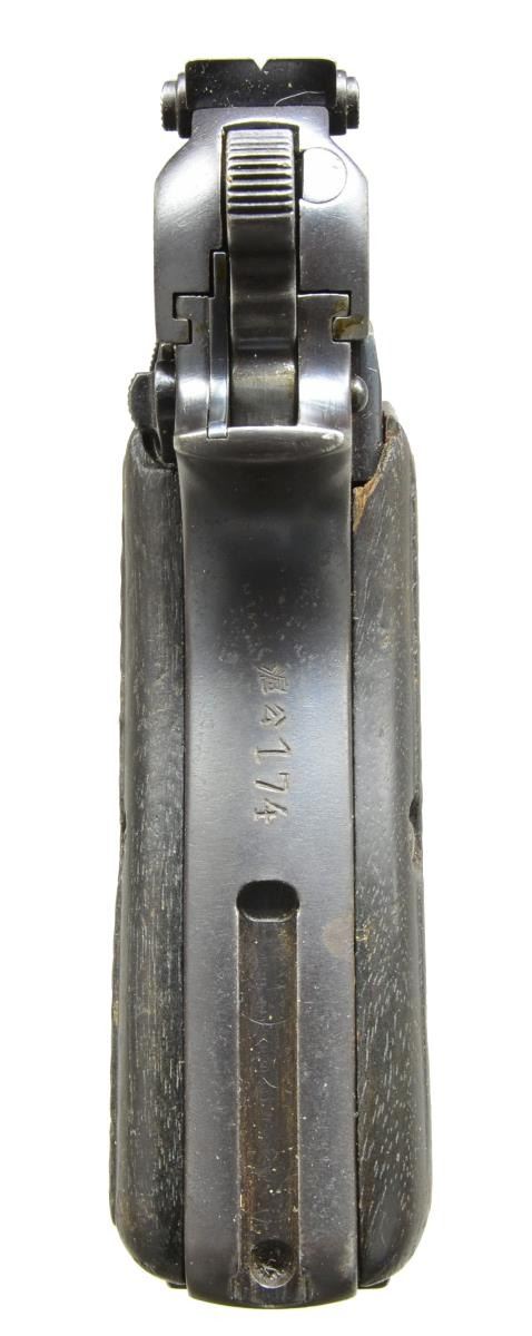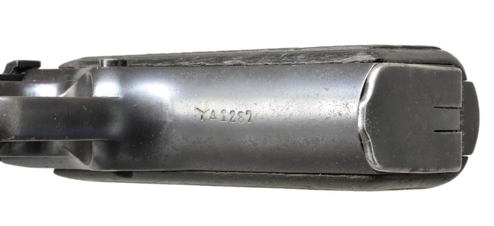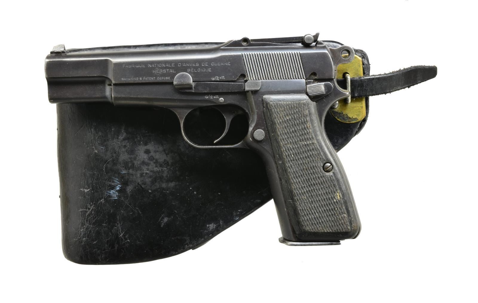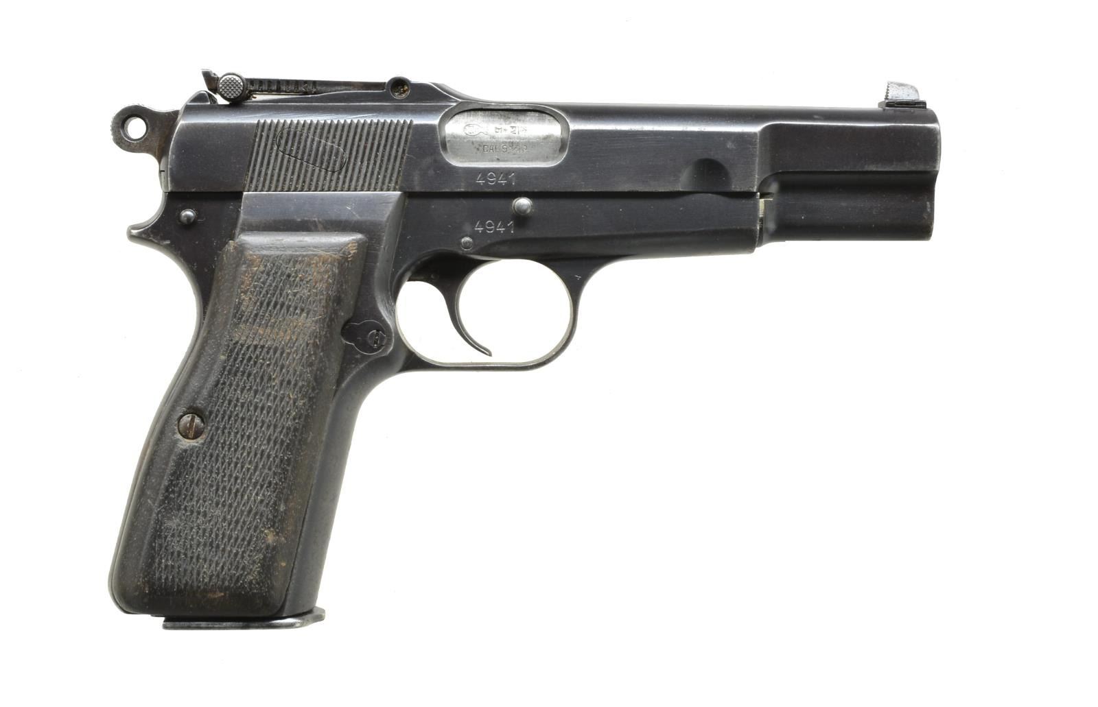 Cal. 9mm Luger. S# 4941. Bbl. 4 3/4". Mfg. approx. 1937 w/ 50-500 tangent sight. Matching numbered slide & bbl. Standard Belgian proofs throughout including crown oval Leige proof on bbl. Frame & slide have star over "N" & bbl. has star over "E". S# range w/in Lithuanian contract & has Lithuanian proof on left side of bbl. lug but no sign of signature Lithuanian lanyard loop. Left side of frame under grip has Belgian boxed "A" FN final inspection mark. Front strap unit marked w/ 2 angular hash marks followed by "A1287". Factory slotted back strap has 2 Asian characters followed by "174". Rear of butt marked "KFS ATL GA." w/out country of origin indication. Black wood grips w/ border checkering. MAGS: 1 fair to good 13 rd. w/ split base & aluminum follower; base of spine has boxed “A”. UNATTACHED ACCESSORIES: good plus black Belgian military holster w/ “21135” stamped under flap along w/ inked “NEUJEN”. CONDITION: good general appearance as refinished over faint pitting. Occasional marks, high point wear & scattered peppery oxidation. Fair hand worn grips w/ marks & sm. chips. Fair to good bore w/ even light frosting. (20-3034/NW). CURIO. $800-1,200.