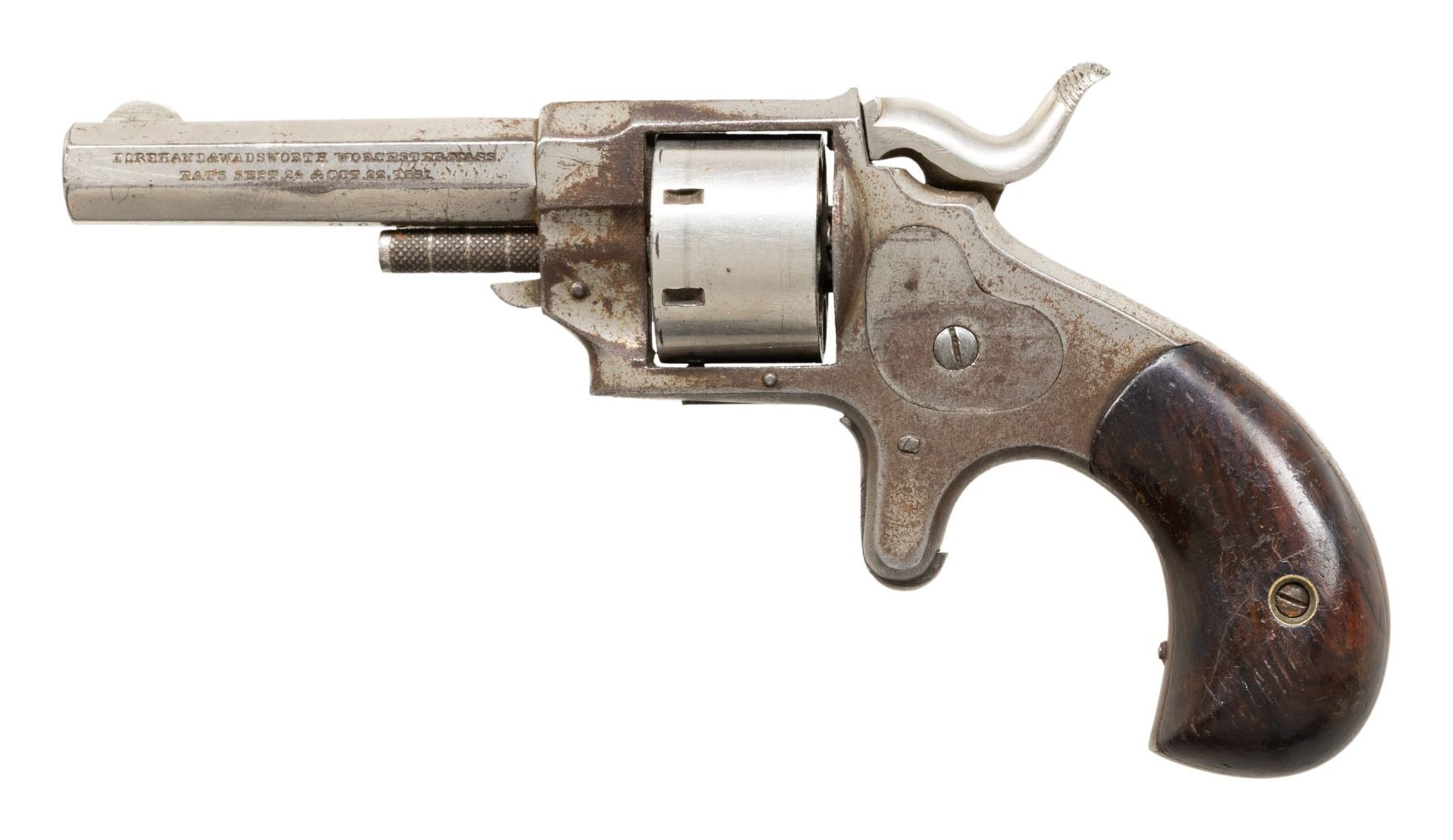 Cal. 22 Short. S# 36138 (under left grip). Matching numbers on oct. 2 3/8" bbl., 7 Shot cyl. & rosewood grips. Nick finished Iron frame has replacement hammer. CONDITION: fair nickel with peeling finish & oxidation. Good grips with spots of wear. Fair worn rifling. Missing mainspring, unable to cock hammer. PROVENANCE: Estate of Groves Herrick. (01-28358/MD). ANTIQUE. $50-100.