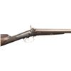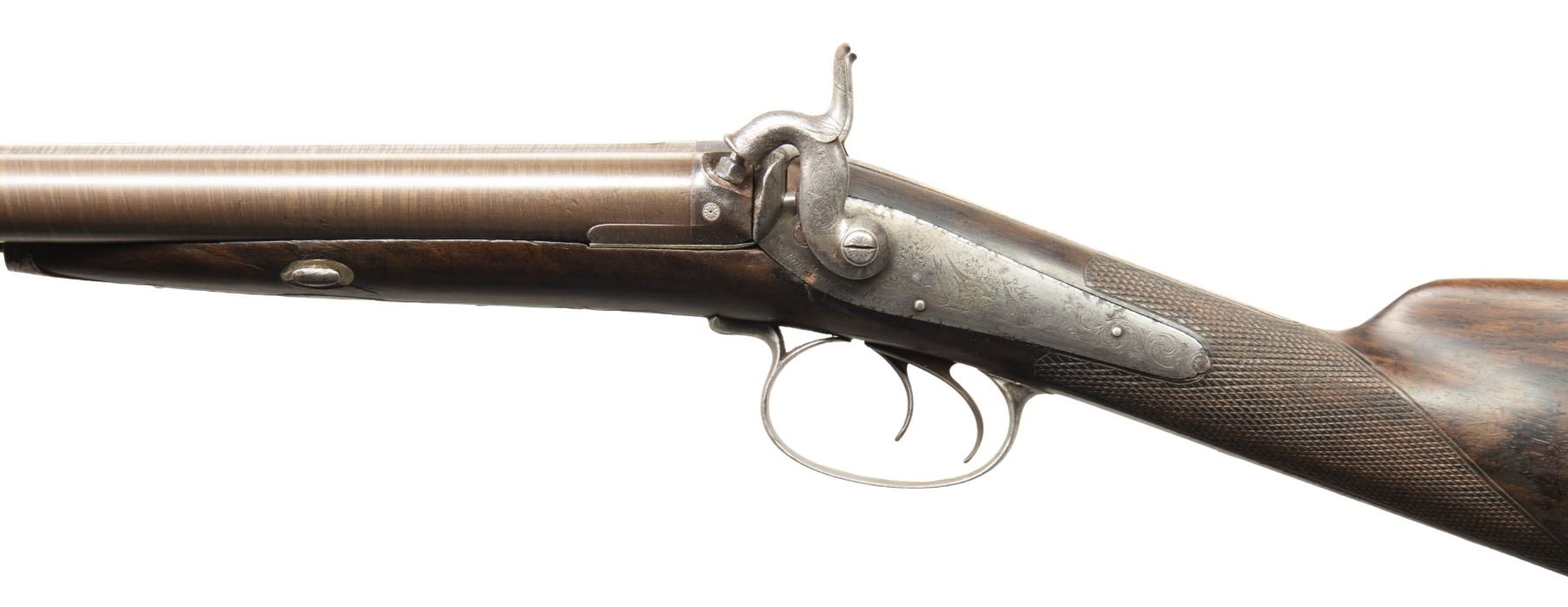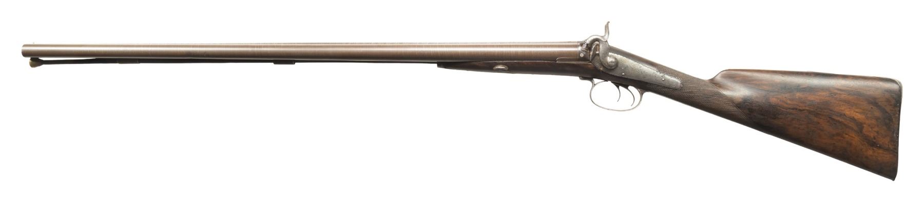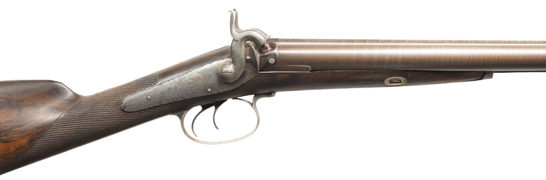 SHOTGUN. Cal. 12 Ga. S# 4059. The Thomas Parkin made 29" bbls. w/ brass bead; chokes appear to measure Mod. Molded nipple wells have platinum vent plugs. Lefaucheux back action locks with moulded breast hammer stops. Scroll engraving with highlighting vignettes of pheasants. Engraving extends to dolphin's head hammers, top tang, peak of buttplate, one piece thimble & pineapple finial triggerguard, and triggerguard bow having vignette of fox. Top tang has engraved "W.P' in gold name plate. Wedge fastened walnut stock w/ checkering at straight wrist. Replacement brass tipped ramrod. CONDITION: This gun appears to have been re-freshened with re-browned barrels, new wood finish & checkering. Barrels show fair faded brown finish with cleaned pitting along forearm channel & large area of pitting left tube. Wood has good appearing finish with handling marks, repaired crack through left side wedge escutcheon (half of escutcheon is missing)& epoxy repair right side in front of lock. Dark bores show oxidation. Locks appear mechanically fine. (01-28486/MD). ANTIQUE. $600-1,000.