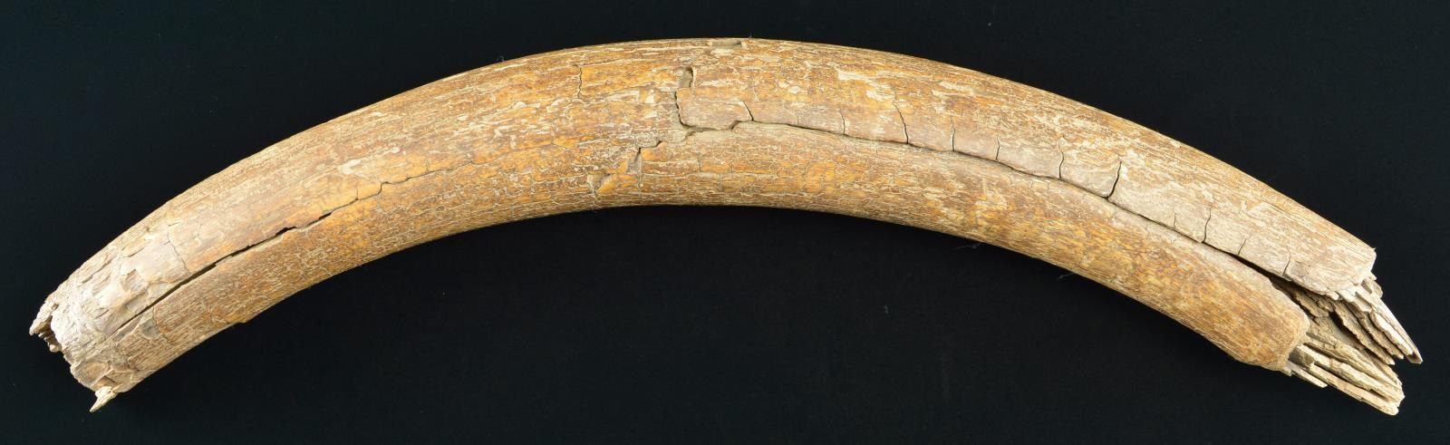 27” overall, 3” diameter, just over 8 pounds. This rough section of a Woolly Mammoth tusk has mostly smooth weathered bark-like exterior. Woolly mammoths lived for over 250,000 years in the northern portions of the globe. Fossil remains are found mostly in Russia and Alaska, they became extinct about 10,000 years ago. CONDITION: good overall, sound & solid with numerous cracks and some chips to the “bark”. A mixture of earthtone brown hues and the natural break make this an interesting specimen to display. PROVENANCE: From the Lifelong Collection of Glen E. Mattox. (02-18971/JS). $800-1,200.