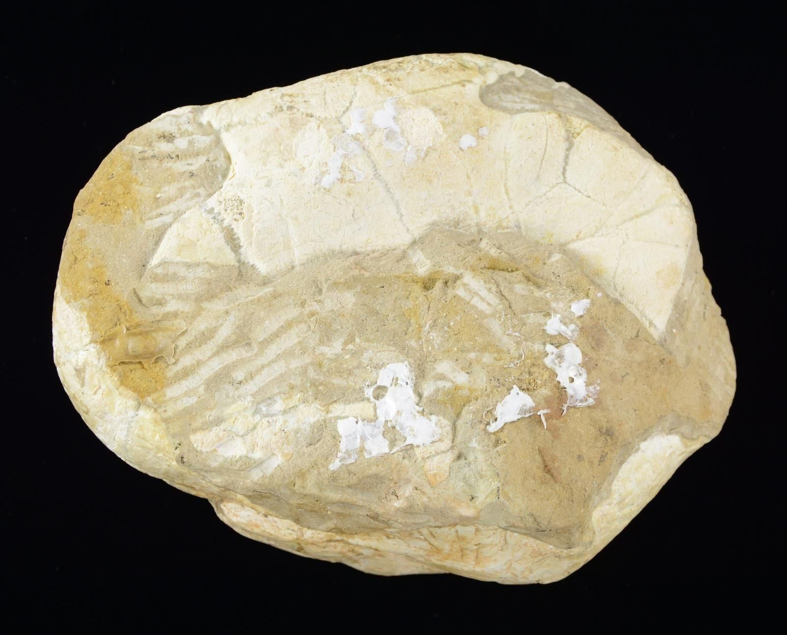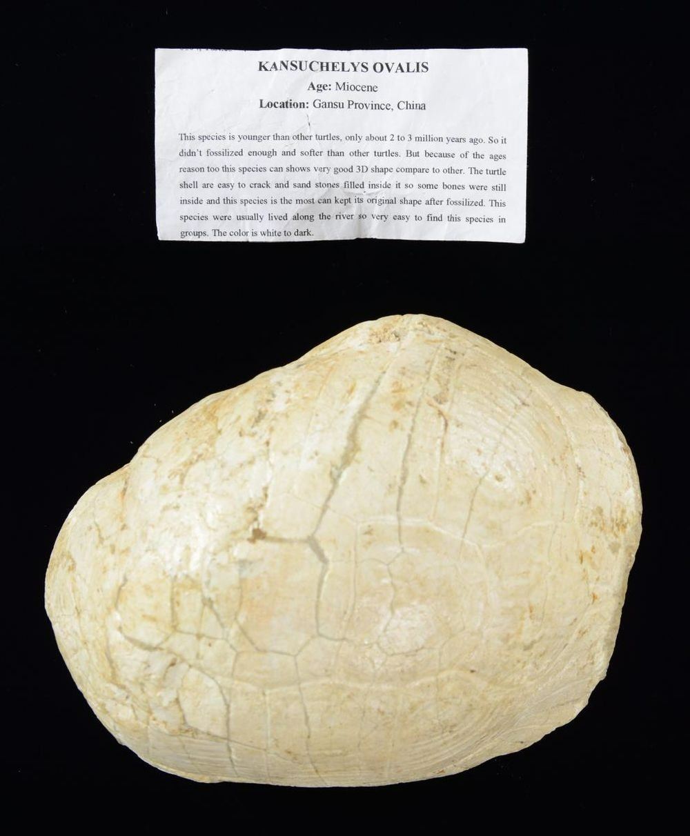 This exceptionally interesting fossil is for Kansuchelys Ovalis & dates to the Miocene era. This particular example was found in Gansu Province, China. This particular species of turtle lived about two to three million years ago, & the fossilization is not as complete as many older turtles. The shell holds its overall 3-dimensional shape quite well. The Kansuchelys Ovalis generally lived along rivers & streams in small groups. CONDITION: fossil retains very good form & shape, and remains quite solid. PROVENANCE: from the Lifelong Collection of Glen E. Mattox. (02-18969/BF). $400-600.