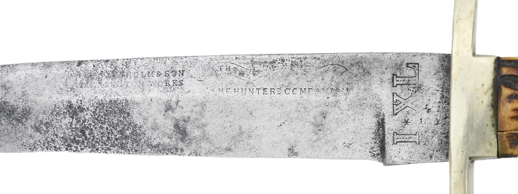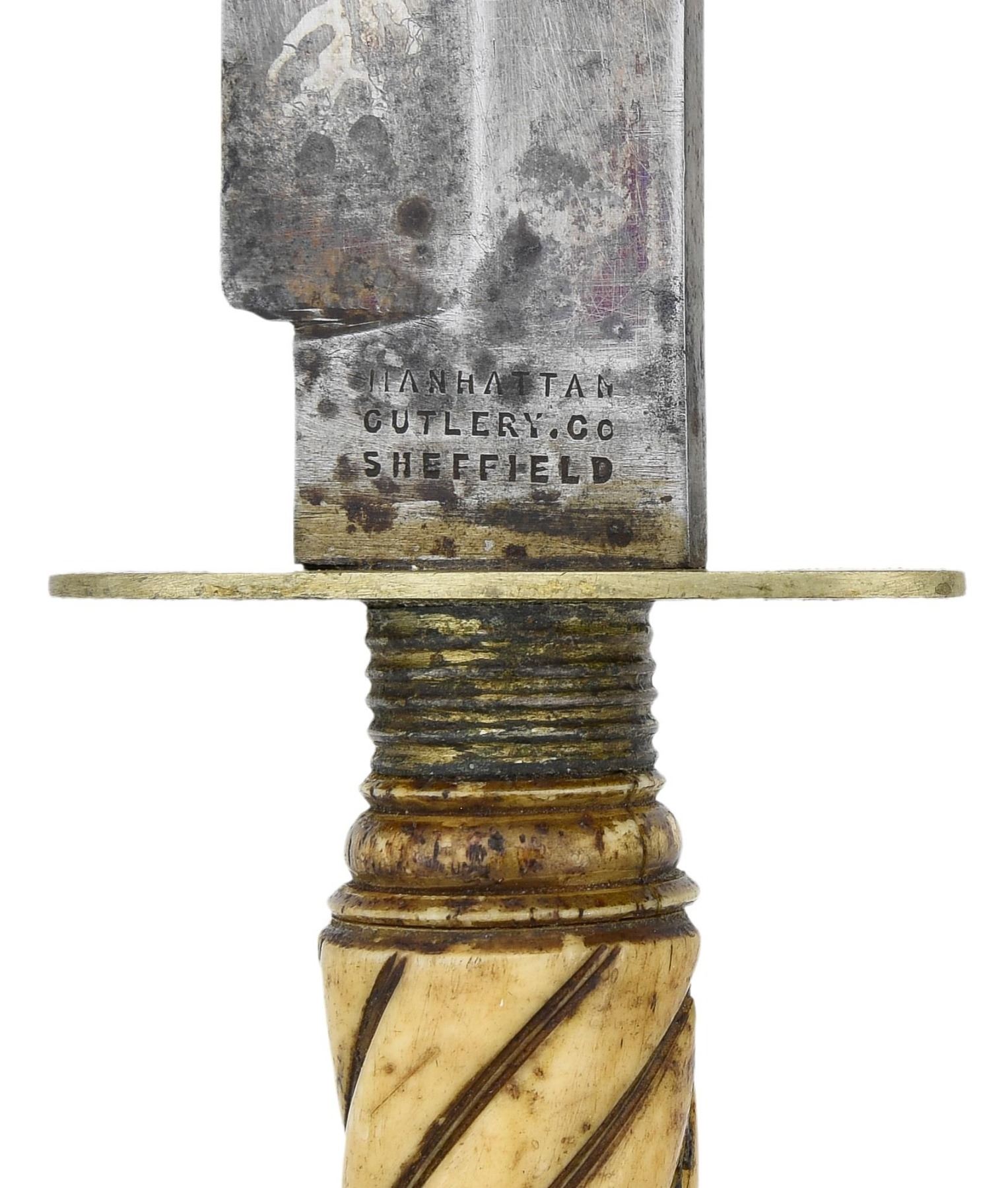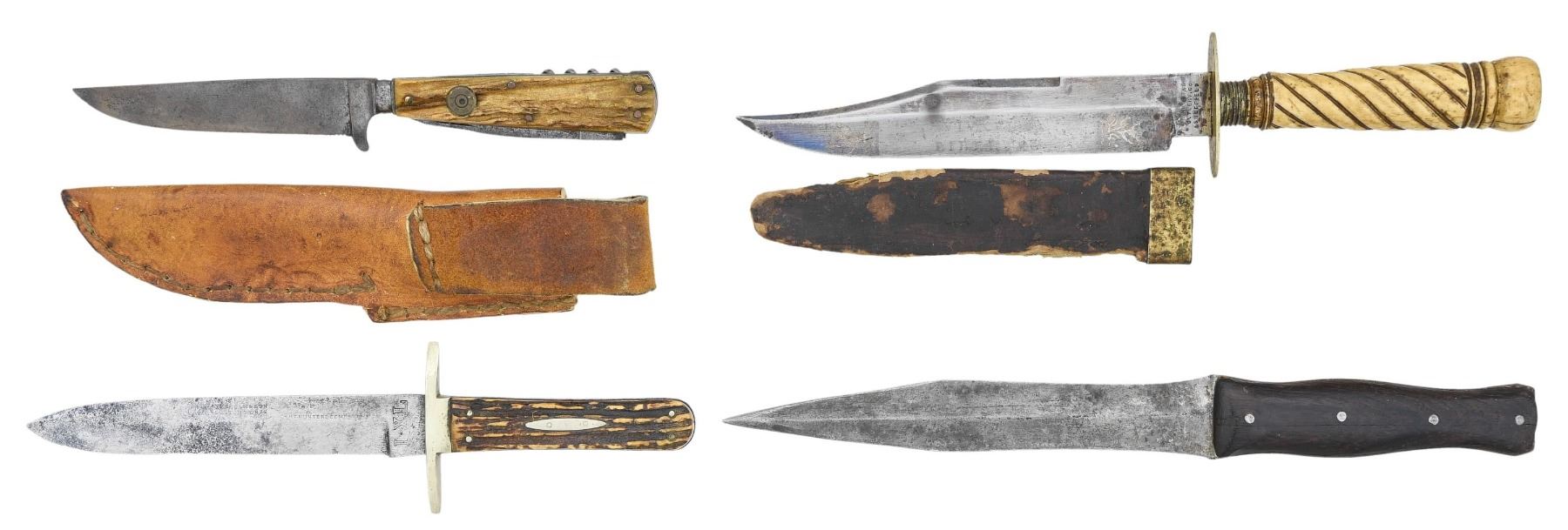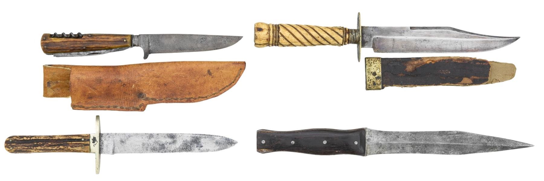 1) 10" overall, 6" spear point blade, full tang, "IXL / G. WOSTEMHOLM & SON / WASHINGTON WORKS / SHEFFIELD", "THE HUNTERS COMPANION", forged 2.25" German silver cross guard, stag slab handle. Blade is fair, markings worn and partially discerned, sharpening, pitting. 2) 11.5" overall, 7" clip point blade, "MANHATTAN / CUTLERY CO / SHEFFIELD", 2" oval German silver cross guard, spiral carved bone grip, partial Sheffield composite sheath. Blade is fine & retains some blue & gold decoration, original sheath poor & partial. Bob McCubbin auction, lot 611A, Brian Lebel auction, Jan 26, 2019. 3) 12" overall, 7.5" dagger point blade, medial ridge, full tang, sculpted blade and tang, pinned wood slab handle. Good overall. 4) Combination hunter's knife, 8.5" overall, 4.75" forged bolster blade, stag slab handle has fold-out cork screw, saw blade, and skinning blade. 38 CF cartridge head inset in stag. Leather sheath with belt loop. Good overall. PROVENANCE: The Esteemed Norm Greenberg Collection. (02-24849-12/JS). NON-GUN. $1,200-1,500.