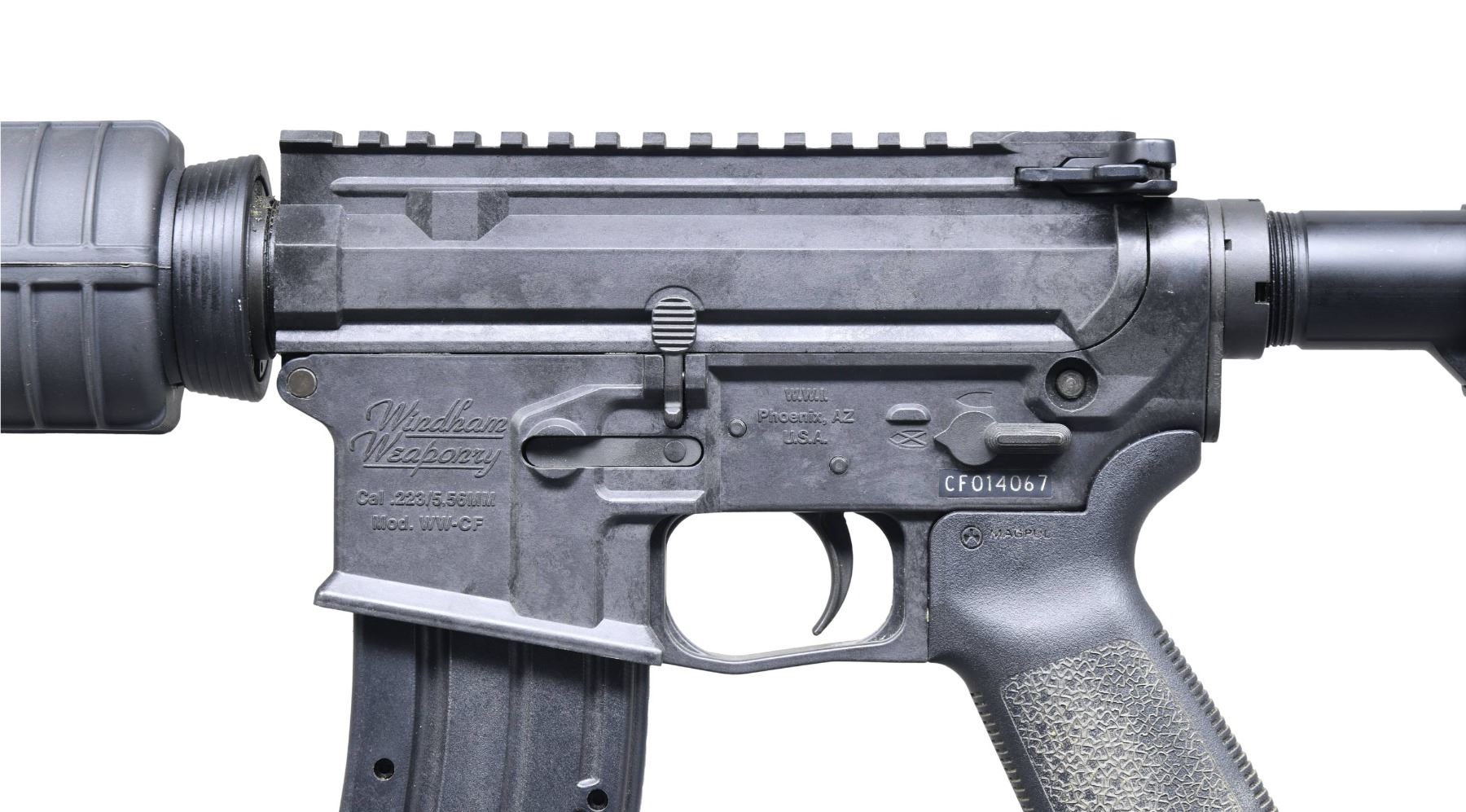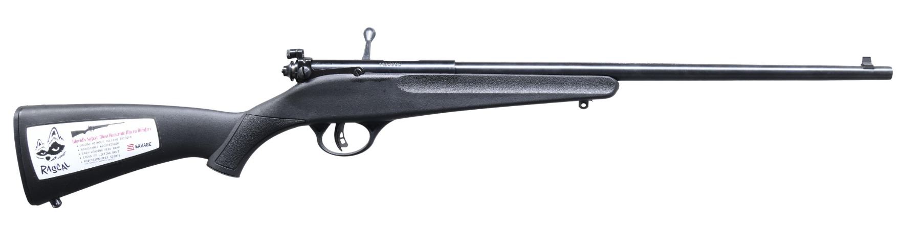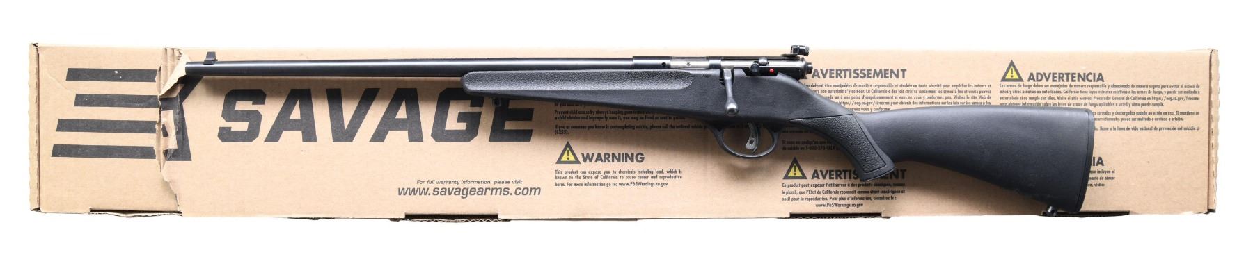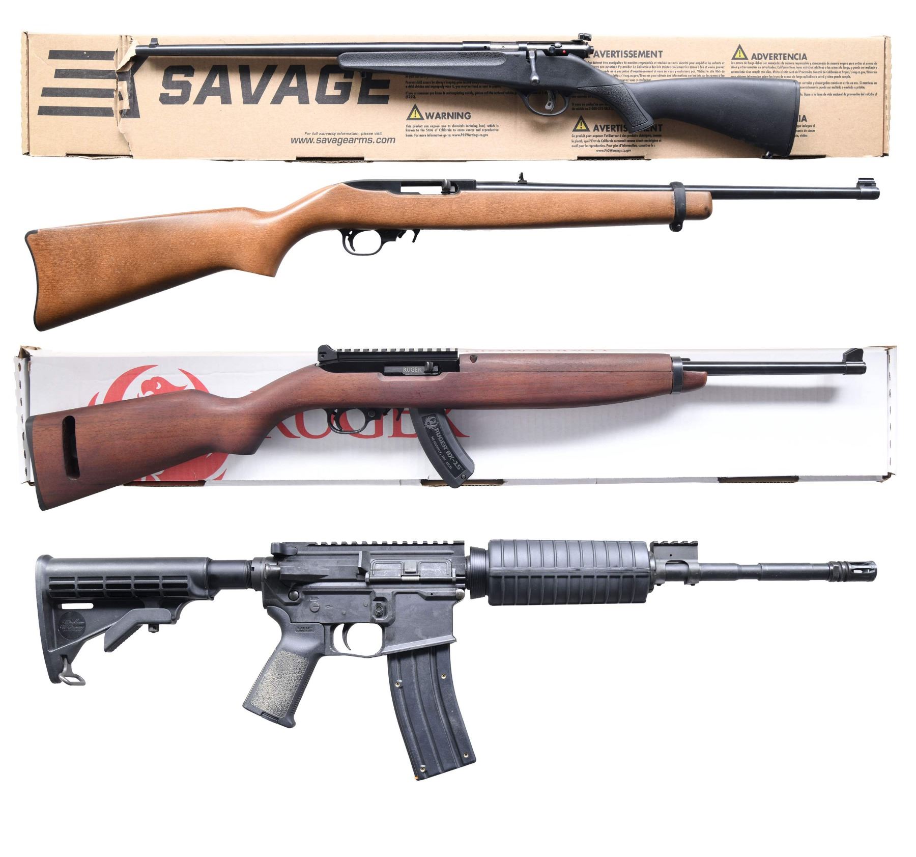 1) NEAR NEW SAVAGE RASCAL SINGLE SHOT BOLT ACTION RIFLE WITH MATCHING FACTORY BOX. Cal. 22 S, L, LR. S# 4123905. Bbl. 26". Rascal single-shot bolt-action rifle mfg. by Savage in Canada and imported by Savage Arms Inc. Top of the bbl. is marked with the model and cal. designations, as well as Savage's mfg. and patent information. Metal components exhibit a blue finish, save for on the bolt body, which is polished in-the-white. One-piece, textured black polymer pistol grip buttstock. Blade front sight with aperture rear sight. UNATTACHED ACCESSORIES: Matching factory box. CONDITION: Near new, with metal components retaining virtually all of their original factory finishes overall. Mirror bore, exhibiting well-defined rifling throughout. Stock is excellent overall. Box shows some exterior wear, with a large tear to the lid, but is otherwise serviceable. (24-7076/MLW). MODERN. 2) RUGER MODEL 10/22 SEMI-AUTO CARBINE. Cal. 22 LR. S# 0004-34050. Bbl.18 1/2" with banded brass bead front sight and folding leaf rear. Mfg. 2015 with model number 01103. Walnut stained hardwood stock with carbine buttplate. Late production example with polymer trigger guard assembly and extended magazine release. MAGS: 1 factory 10 rd. CONDITION: very good to excellent overall with minor handling marks on stock set and a small mark on barrel near front sight. Missing filler screws in scope base mounting holes. Near excellent bore. (24-7077/NW). MODERN. 3) NEAR NEW TALO EXCLUSIVE RUGER 10/22 CARBINE STYLE SEMI-AUTOMATIC RIFLE WITH MATCHING FACTORY BOX. Cal. 22 LR. S# 0023-89506. Bbl. 18 1/2". Talo distributor exclusive 10/22 Carbine (Model #21138) semi-automatic rifle mfg. by Ruger in 2023. Left side of the receiver is marked with the S#, followed by the model and cal. designations, as well as Ruger's mfg. information. Aluminum receiver exhibits a black enamel-type finish, with the bbl. exhibiting a blue finish. Plain wood M1 Carbine pattern buttstock and handguard. Blade front sight with aperture rear sight. Receiver is fitted with a black polymer Picatinny rail. MAGS: One 25-rd. UNATTACHED ACCESSORIES: Matching factory box. CONDITION: Near new, with metal components retaining virtually all of their original factory finishes overall. Brilliant mirror bore, exhibiting well-defined rifling throughout. Wood furniture is excellent overall. Box shows exterior wear and a couple of tears from handling and storage, but otherwise remains serviceable. (24-7078/MLW). MODERN. 4) WINDHAM WEAPONRY MODEL WW-CF SEMI-AUTOMATIC RIFLE WITH HARD CASE. Cal. 22 LR. S# CF014067. Bbl. 16 1/4". Model WW-CF semi-automatic rifle mfg. by Windham Weaponry. Left side of the receiver exhibits standard markings, denoting the model and cal. designations, Windham's mfg. information, as well as the S#. Black polymer receiver and flat top upper, with black polymer adj. buttstock, MAGPUL textured pistol grip, and short ribbed handguards. M4 profile CMMG Wasp .22 LR bbl. MAGS: 2 30-rd. UNATTACHED ACCESSORIES: black plastic hard case. CONDITION: good, with some superficial marks from handling and storage overall. Mirror bore, exhibiting strong rifling throughout. Polymer furniture is good overall. (24-7080/MLW). MODERN. $900-1,100.