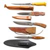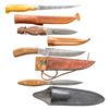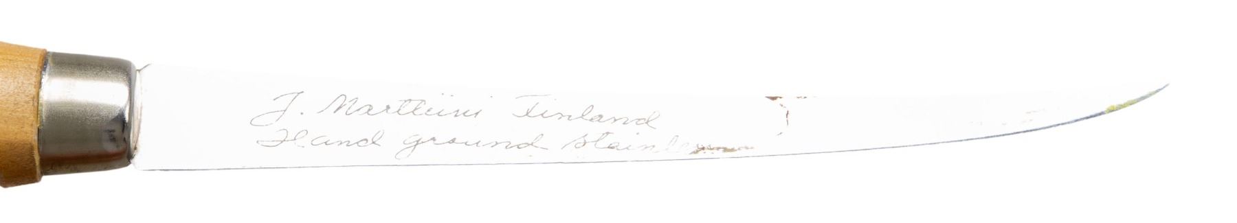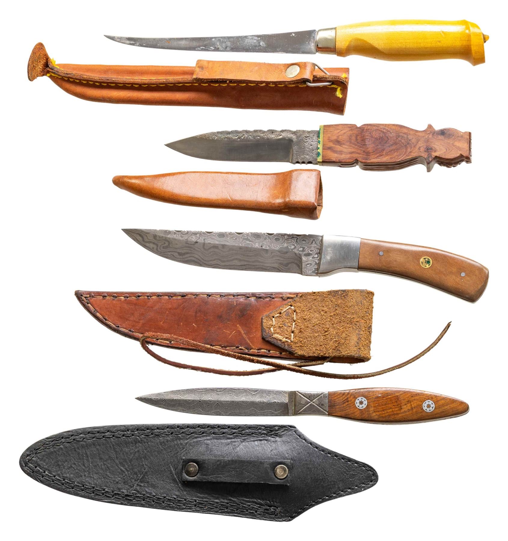1) 10" overall, 5.5" damascene clip point blade, full tang, scallop cut back, steel bolsters, pinned fruitwood slab grips, brown leather sheath. 2) 8.5" overall, 4.25" damascene dagger blade, damascene steel bolster, full tang, tapered wood slabbed grip, fitted black leather sheath. 3) 8.5" overall, 4.5" spear point blade, saw tooth top edge, steel is rough forged, signed "AF", polished saber ground cutting edge & point, guardless 3-side carved sculptured handle terminating into pineapple pommel, Scandinavian style open mouth brown leather sheath. 4) Custom fishing knife, 6.25" thin tapered blade etched "J. Marttiini Finland / hand ground stainless", maker marked embossed sheath. CONDITION: fine to excellent overall. (02-25213/JS). NON-GUN. $300-500.