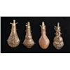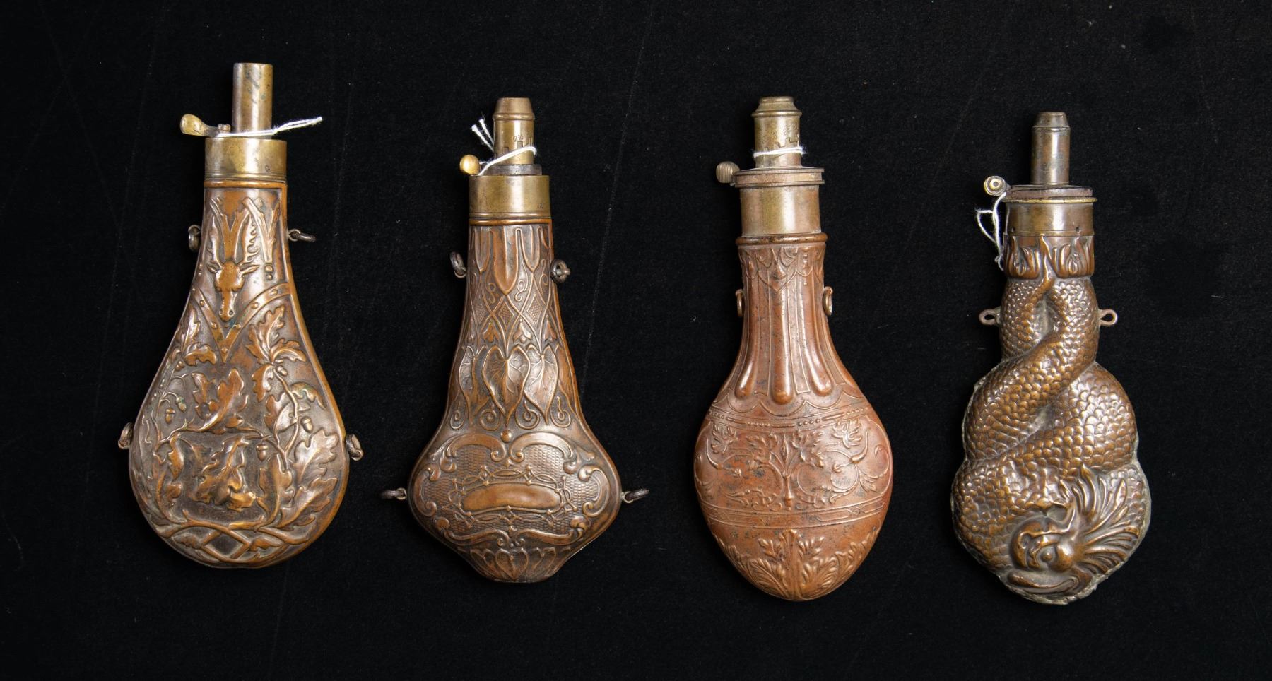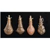 FOUR LARGE DECORATED POWDER FLASKS.