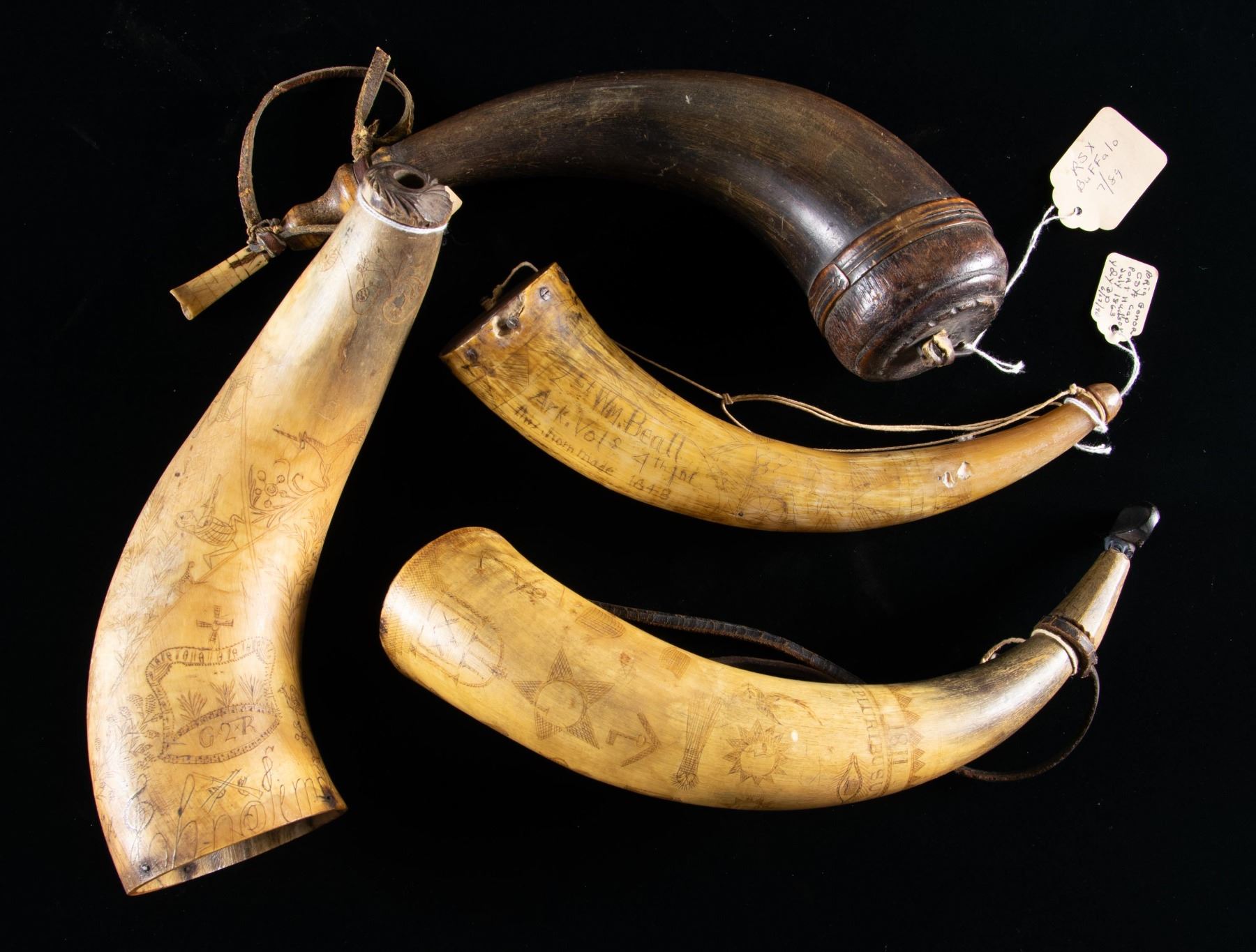 10" 18th century fully carved with King George II crown, missing plug, carved name around base, hunter and deer, unicorn, fountain, flowers, bird; 12" "1811 E PLURIBUS UNUM", "FM" nicely carved on plug, well executed and spaced masonic emblems, square & compass, all-seeing eye, anchor, ark, blazing star, gavel, beehive, coffin, square & key, hourglass, snake, ladder, sun with faces, and more; 10" "2 Lt Wm. Beall / ARK. VOLS 4TH Inf / his horn made 1848", crossed rifles, mounted rider, crossed American flags, cannon, cannon balls, buildings, insect damage around base; 11" dark horn, banded tall wood plug, carved sculpted tack attached spout, with carved combination stopper & measure. Old collection tags. CONDITION: good overall. PROVENANCE: The Esteemed Norm Greenberg Collection. (02-24847-14/JS). NON-GUN. $1,000-1,500.
