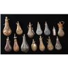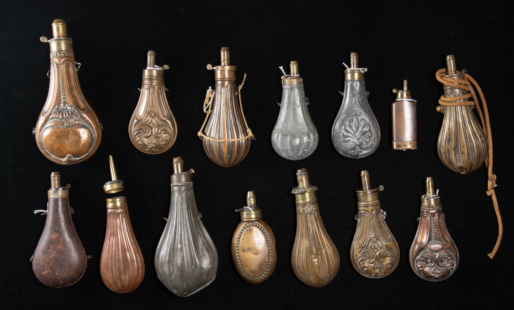 1) 7" "W. POWELL & SON-BIRMINGHAM", looks like Riling 504 but this one marked. 2) 7" zinc, Riling 338. 3) 7" zinc, Riling 262. 4) 10" Dixson, Riling 558. 5) 8.25" American Flask Co, Riling 296. 6) 7.5" Riling 504. 7) 8.25" "G. WINGHAM" Riling 289. 8) 9.5" fluted zinc, dented & broken butt. 9) 8" "FLASK & CAP", Riling 276. 10) 7" Riling 503, dented. 11) 6.25" Riling 482. 12) 8" leather covered, labeled riling 1209. 13) 4.5" 3-compartment, Riling 163. 14) 7.5" fluted missing charger top and reproduction charger. CONDITION: good as described. (02-25915/JS). NON-GUN. $800-1,200.