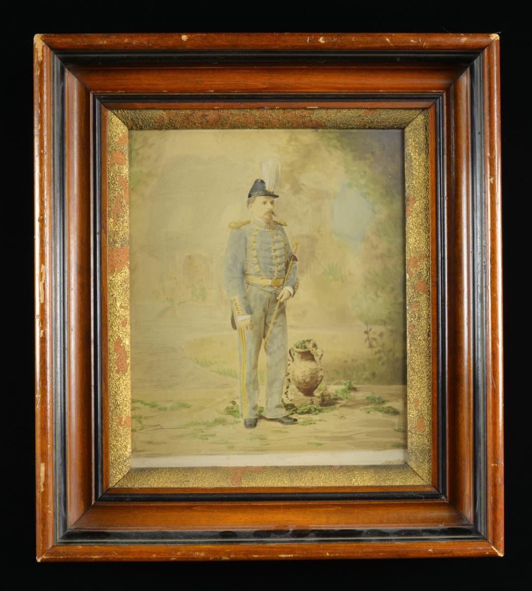 Mount about 10” x 12” in 14.6” x 16.5” frame, posed full standing with sword and shako. CONDITION: very good overall, light fading. (02-17542/JS). $400-600.