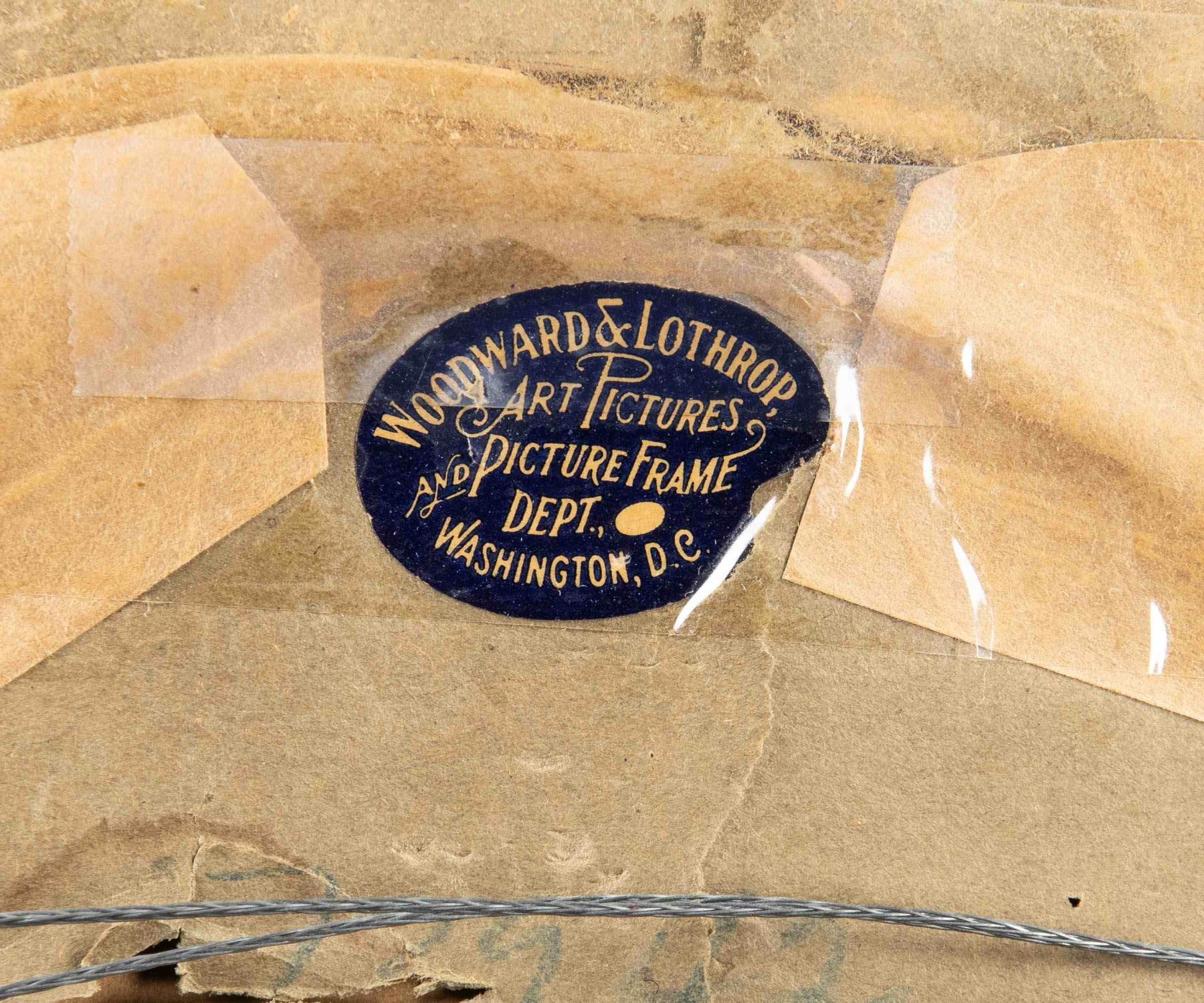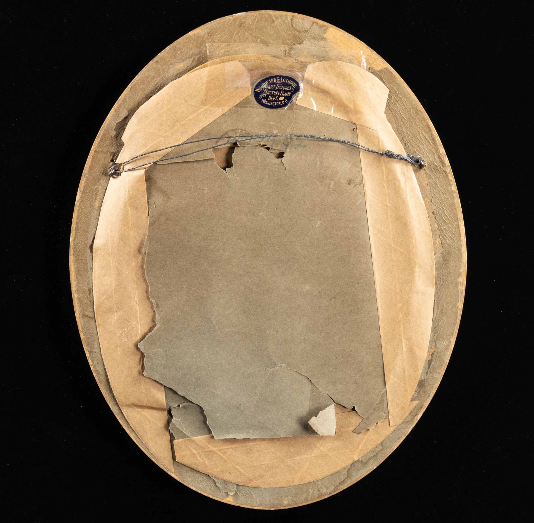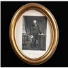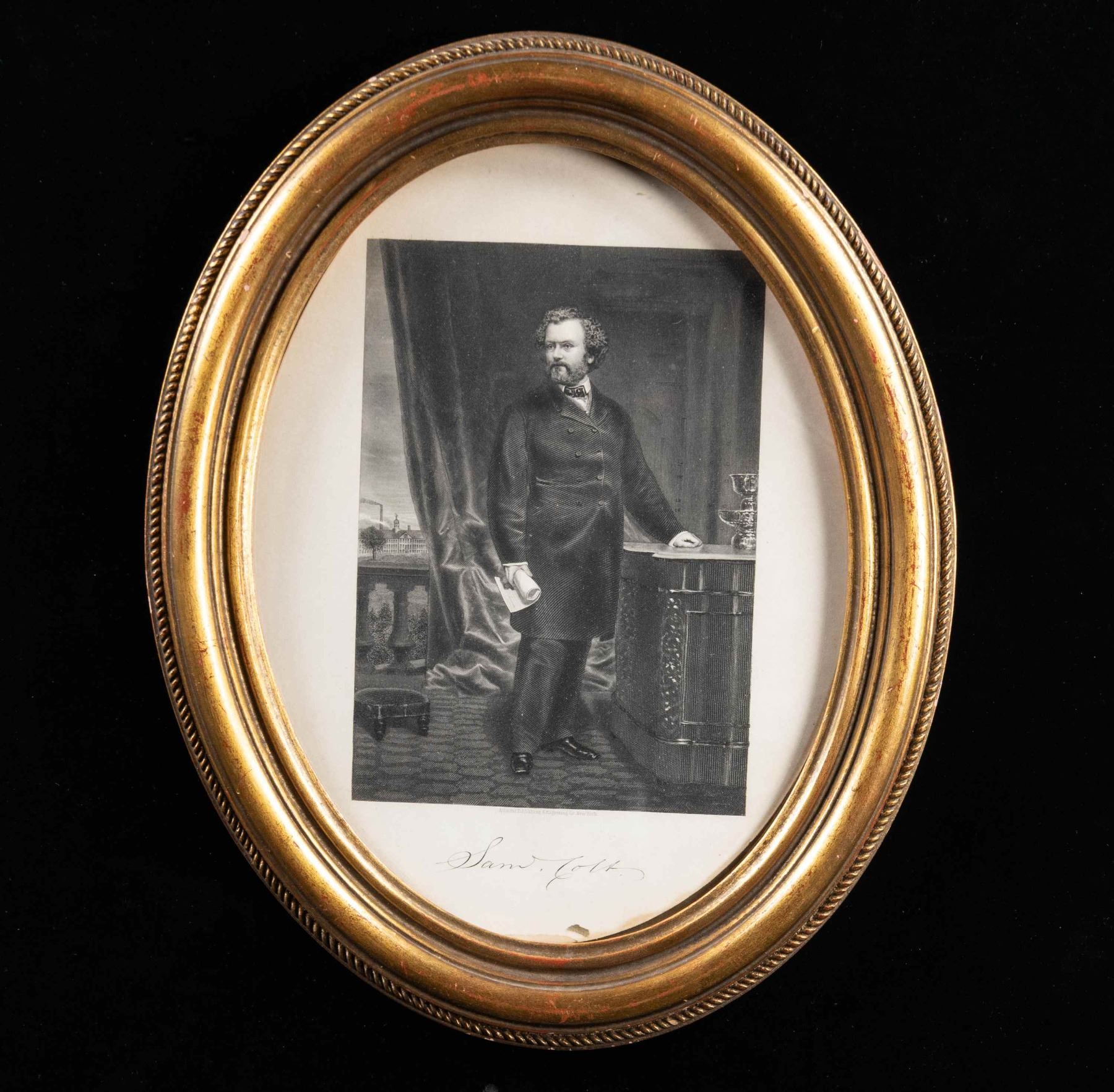 Framed print portrait of Samuel Colt, originally engraved by George Catlin printed on paper applied to a cardboard sheet. Below the portrait exhibits "Atlantic Publishing & Engraving Co New York" above Samuel Colt's signature. Print is housed within a gold colored oval frame, with framer's label "WOODWARD & LOTHROP,/ ART PICTURES/ AND PICTURE FRAME/ DEPT., WASHINGTON, D.C."on rear. Frame measures 14 3/4" tall and 11 3/4" wide. CONDITION: portrait is good, showing some age related discoloration, as well as some staining along the edges. Frame shows some scattered handling marks and small surface level chips, with a taped repair present at the top of the paper on the rear. (02-25595/MLW). NON-GUN. $50-150.