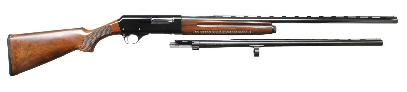 Cal. 20 Ga., 2 3/4". S# C39535 (XX9 = 1973). Bbl. 28" w/ VR & bright bead. Long recoil action w/ alloy receiver. Satin finished checkered walnut stock set. LOP: 14 3/4" to black Old English pad. Imported by Stoeger. UNATTACHED ACCESSORIES: non matching 24" VR bbl. w/ American Arms markings & choke tube. Bbl. in very good condition. CONDITION: very good metal finish w/ light handling wear & fading. Very good wood finish w/ a few streak gouges on both sides of buttstock & numerous impression & scratches. Near excellent shiny bore. (23-196/MD). MODERN. $400-700.