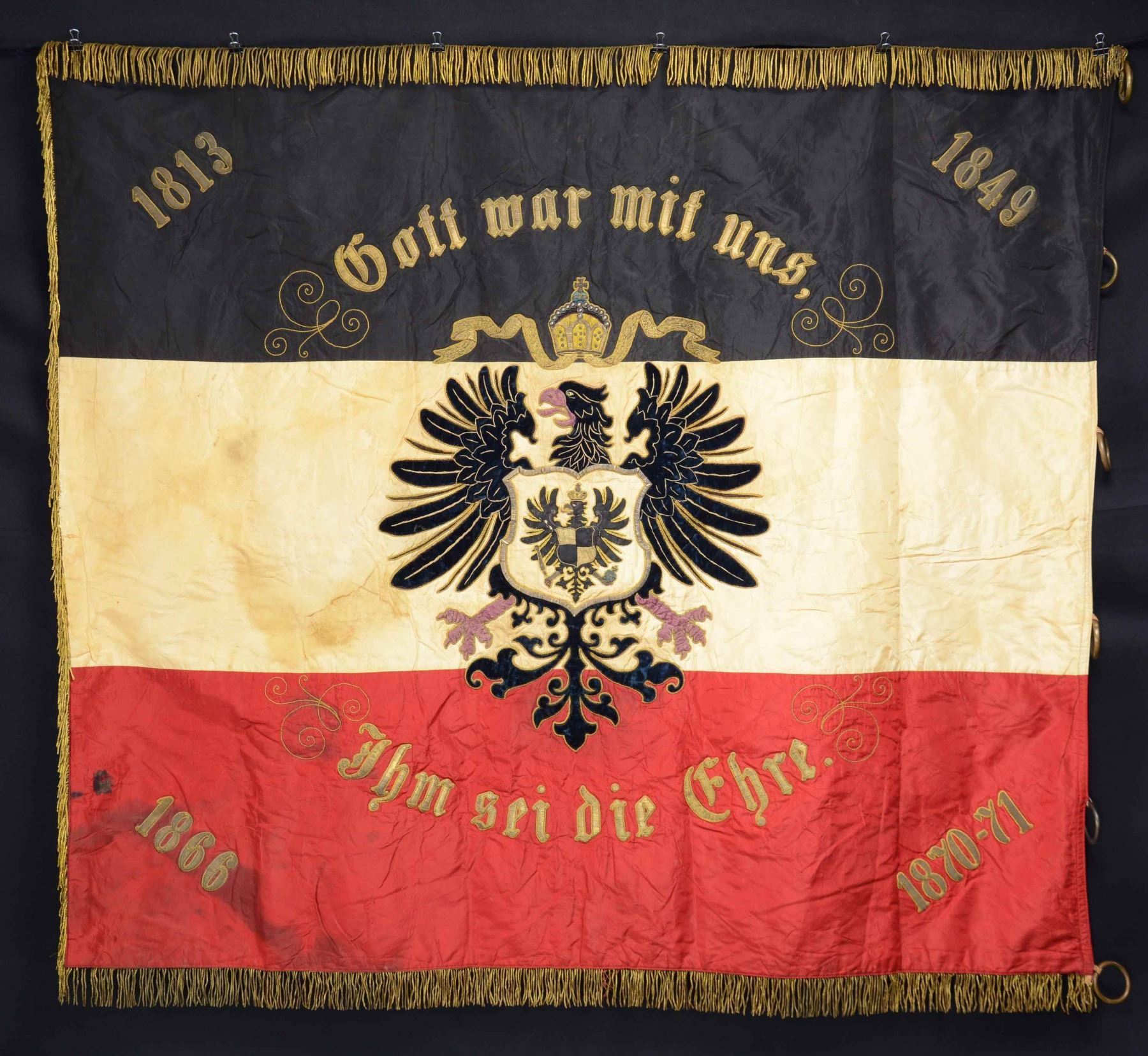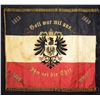SOCIETY BANNER. This very attractive red, white, and black banner measures approx. 53" x 57", including 2 1/2" of gold bullion fringe on three sides. The hoist side has six hollow brass rings attached for suspension. The banner has a plethora of gold bullion decoration with embroidered polychromatic highlights. The front side of the flag reads "Militar- Veteranen-und Kampfgenossen- Verein," "Gew. 1876 Ern. 1931," and "Eschenau." The central motif on this side is a royal cipher with an intricate crown above, all surrounded by an oak and laurel leaf wreath. The other side has the dates 1813, 1849, 1866, and 1870-71, representing the Napoleonic Wars, the War with Italy, the War with Austria, and the Franco-Prussian War. The dates are arranged one in each corner. The central motif reads "Gott war mit uns" above and "Ihm sei die Ehre." below. The central motif on this side is a large, crowned Prussian eagle. CONDITION: the banner remains in remarkable condition, showing expected light wear to the bullion and embroidered areas. The body of the flag has some visible stains but is exceptionally solid for its age. (02-23078/BF). $1,000-1,500.