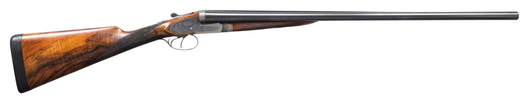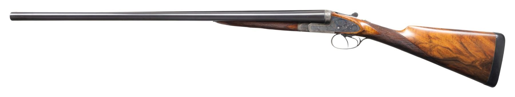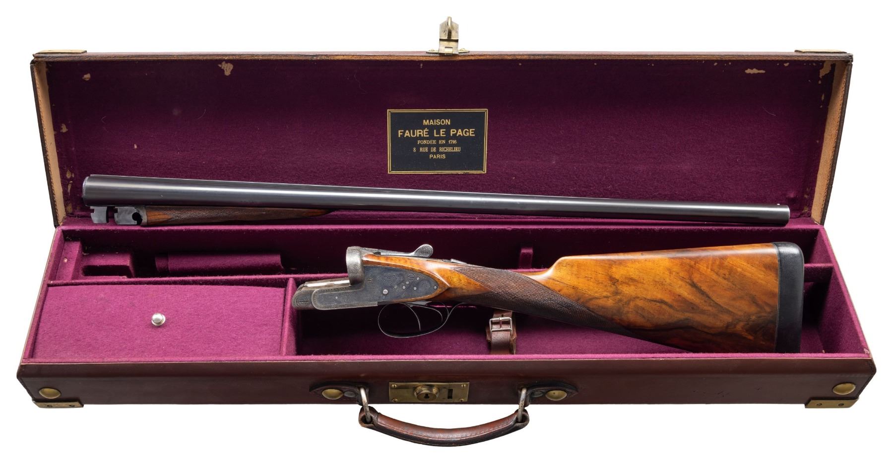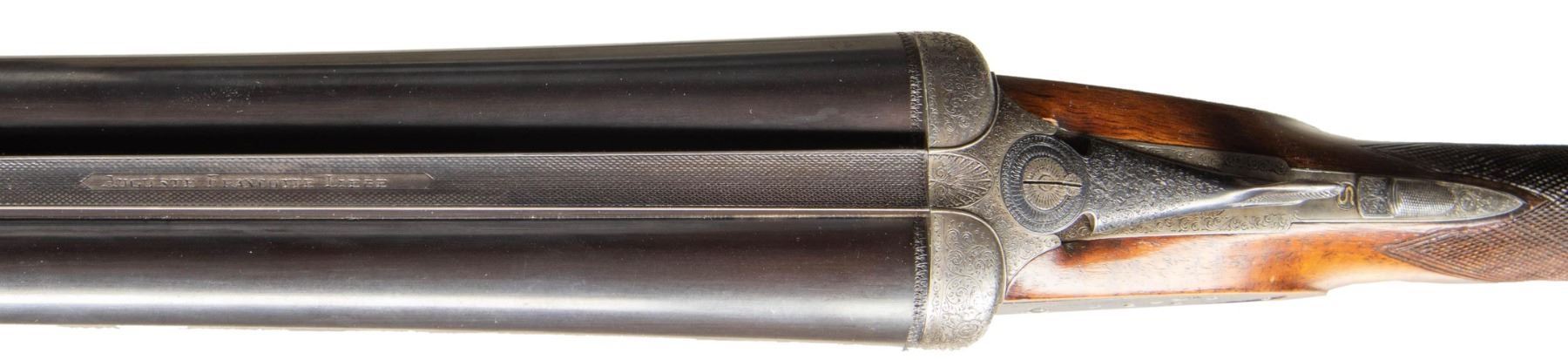 GAME GUN WITH CASE. Cal. 12 Ga. 2-3/4". S# 1825. The 28-1/4" dovetailed barrels are engraved "Auguste Francotte Leige" on slightly raised matted rib. This engraving was definitely done well after this gun was made. Barrel flats are stamped with pre-1920 Belgian nitro proofs for 2-1/2" chambers. Later French nitro proofs and "AF" stamps are also present. Case hardened side lock action is stocked to the fences and features automatic safety, hidden third fastener, bushed strikers and double triggers (front articulated). Action is engraved with very small simple scroll surrounding rose bouquets over nearly all of its surface. No maker's name is present. Steel trigger guard and top lever are engraved to match. Well marbled and nicely fiddle figured European walnut straight grip buttstock measures 14-3/4" over black leather covered pad. Point pattern checkering is at grip. Matching splinter ejector forend has Anson release. MEASUREMENTS: BBLS: Bore Diameter: L .724. R .727. Restriction: L .017 (Mod). R .010 (IC). Wall thickness: L .028. R .029. STOCK: DAH: 2-1/4". DAC: 1-1/2". CAST: about 5/8" off. LOP: 14-3/4". WEIGHT: 6 lb. 15 oz. UNATTACHED ACCESSORIES: gun is housed in leather case with brass corners; lined in burgundy cloth. A black leather gilt label in lid is printed "MAISON FAURE LE PAGE". CONDITION: very fine as partially refinished. Barrels retaining nearly all of an old re-black with newer French proofs and maker's name. Action and lockplates retain about 70% case hardening color. Stocks are lightly refinished. Checkering re-cut. Pad is new. Bores are bright and shiny. Action is tight. Ejectors are slightly out of time. Case leather is good and has added brass accents. Interior is good but shows insect damage. PROVENANCE: From the Private Collection of Berrien Moore III. (25-6017/MGM). CURIO. $2,500-5,500.